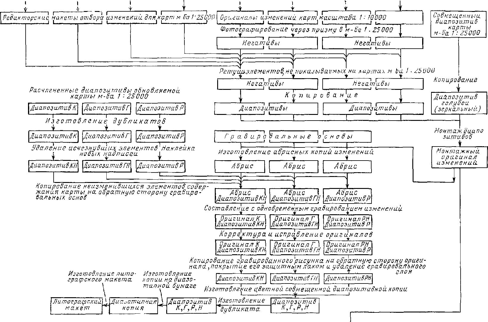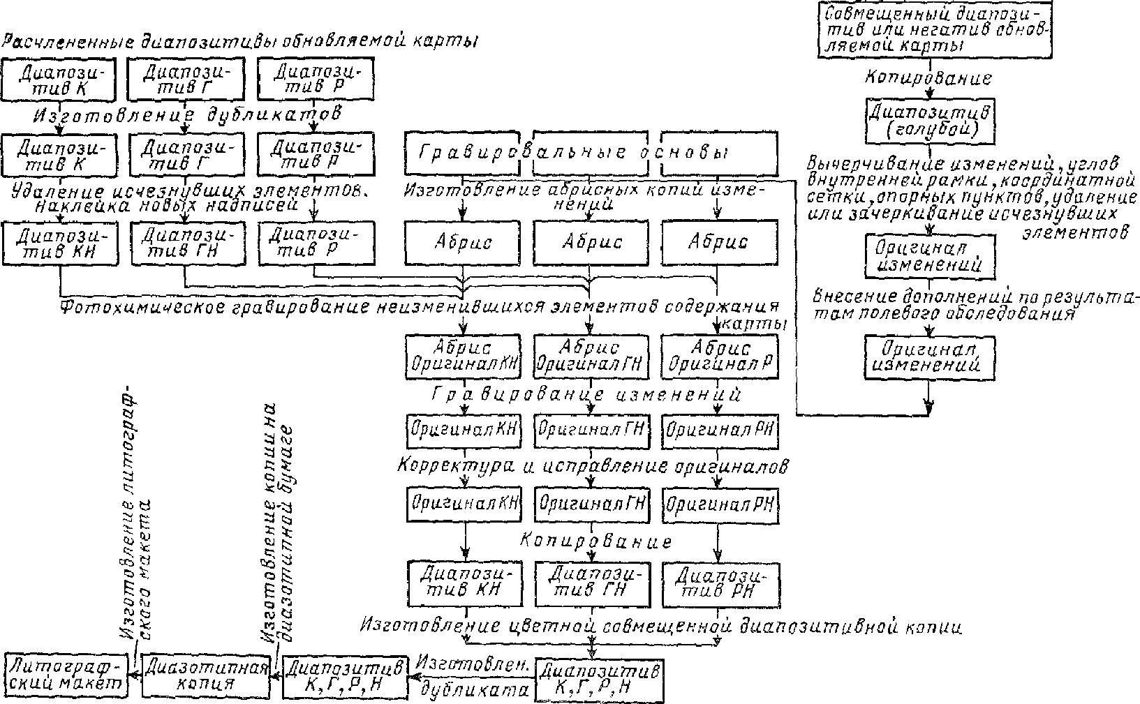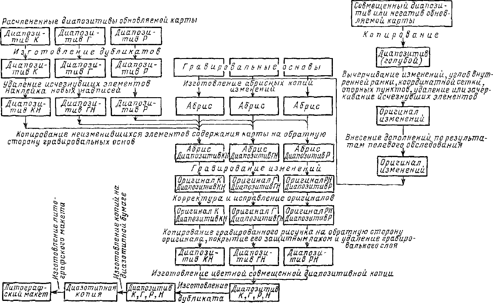 Карты более мелких масштабов исправляются картосоставительскими способами по обновленным крупномасштабным картам и по материалам новых съемок.