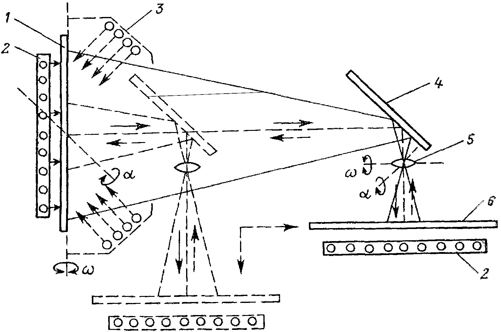 При работе на увеличение (ход лучей показан прерывистыми стрелками) станина прибора с обоими экранами и объективом поворачивается на подставке прибора на 90°, так что экран 1 становится горизонтальным столом, а экран 6 и направляющие занимают вертикальное положение. Аэроснимок в кассете укрепляется на экране 6, к которому переносится осветитель 3 при работе на отражение.