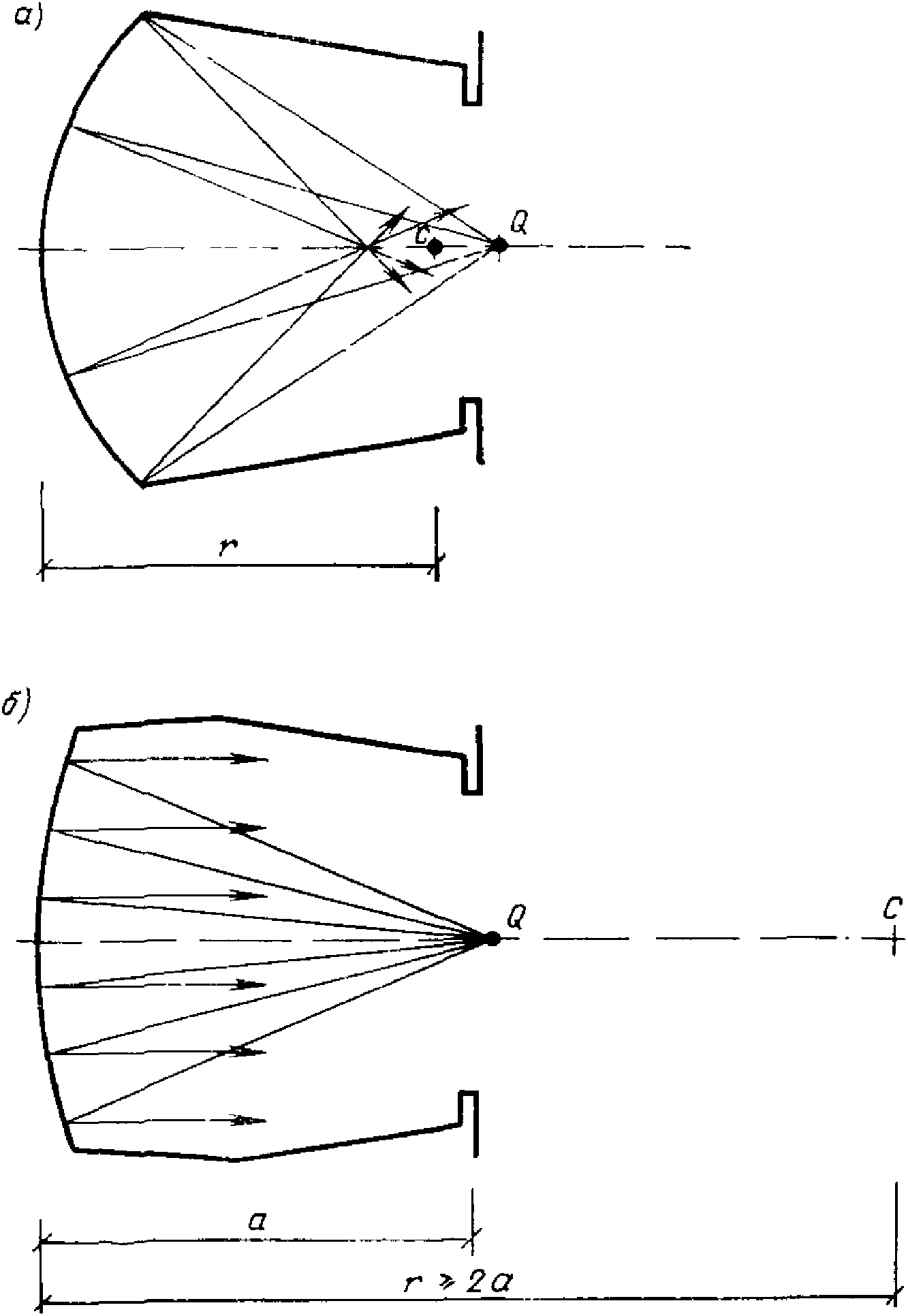 2.11. Распределение звука, отраженного задней частью потолка, улучшается, если потолок имеет наклонный, примыкающий к задней стене участок (рис. 4, а и б). В результате этого отраженный звук направляется, мало запаздывая по сравнению с прямым звуком на задние места партера, улучшая там слышимость. Та же цель достигается наклоном в сторону слушателей задней стены (рис. 4, в). Полезным оказывается (в тех случаях, когда это согласуется с архитектурным замыслом) и наклон в сторону слушателей боковых стен, увеличивающий приходящую к слушателям долю звуковой энергии первых отражений от этих стен.