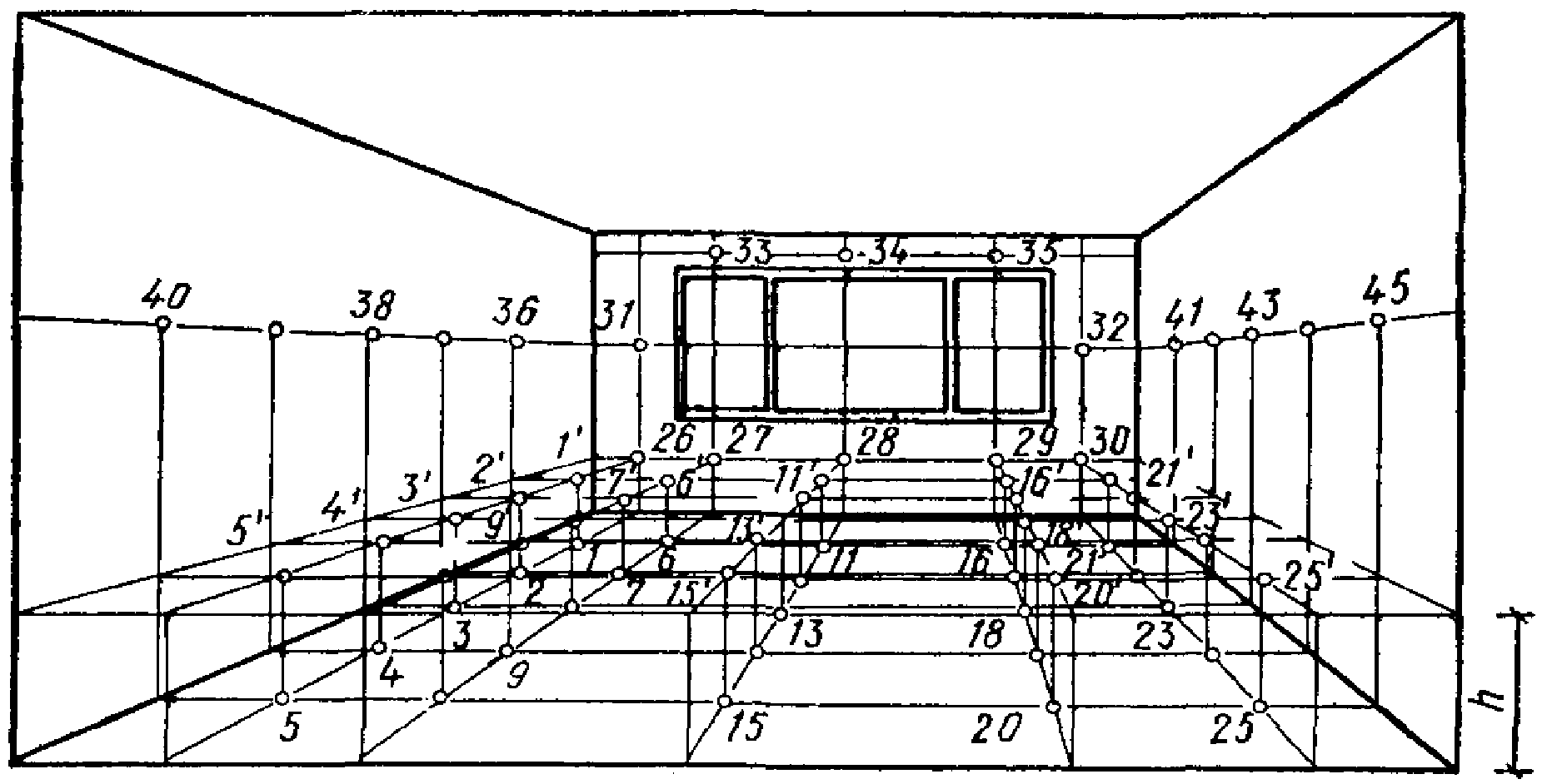 2.4. Измерения распределения яркостей по поверхностям интерьера в поле зрения проводятся в контрольных точках яркомером ЯКП-1 с набором светофильтров. Для получения сопоставимых результатов яркомер должен быть жестко закреплен на штативе, причем расстояние до измеряемой поверхности должно быть не менее двух метров. Схема расположения точек измерений представлена на рис. 3.
