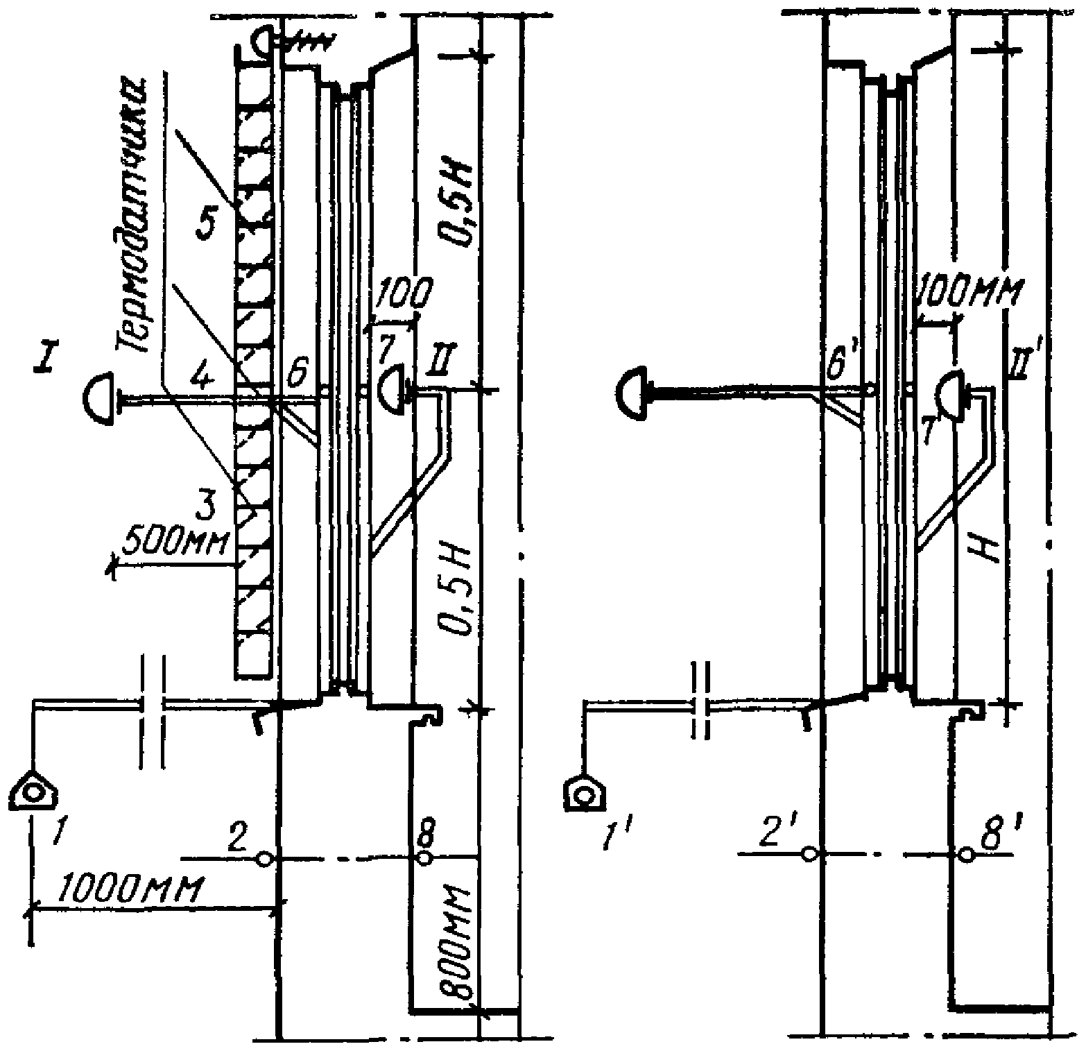 4.1. Аэрационные испытания СЗУ в натурных условиях заключаются в измерении температуры и скорости движения воздуха в пространствах двух одинаковых помещений - опытного (оборудованного СЗУ) и контрольного (без СЗУ). Измерение указанных параметров производится термоанемометрами ЭА-2М в сходственных точках пространства каждого помещения (рис. 10). Измерения проводятся в период максимального перегрева (1400 - 1700 ч местного времени) с интервалом в 1 ч при открытом и закрытом дверном проеме. При регулируемых СЗУ измерения проводятся с учетом величины угла наклона горизонтальных элементов СЗУ.