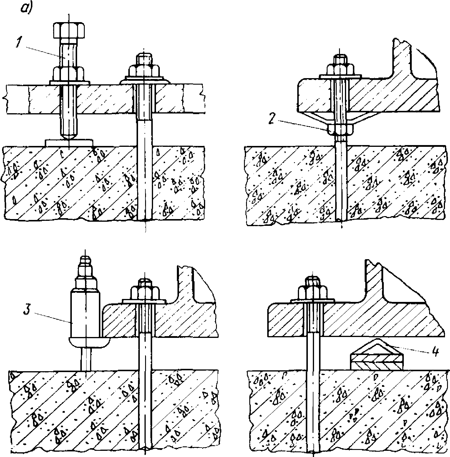Болты с амортизирующими элементами (тарельчатыми пружинами) обеспечивают прочность соединения при меньших глубинах заделок болтов в бетон по сравнению с болтами без амортизирующих элементов за счет упругих деформаций тарельчатых пружин; при этом необходимо предусматривать возможность доступа к нижней части болтов.