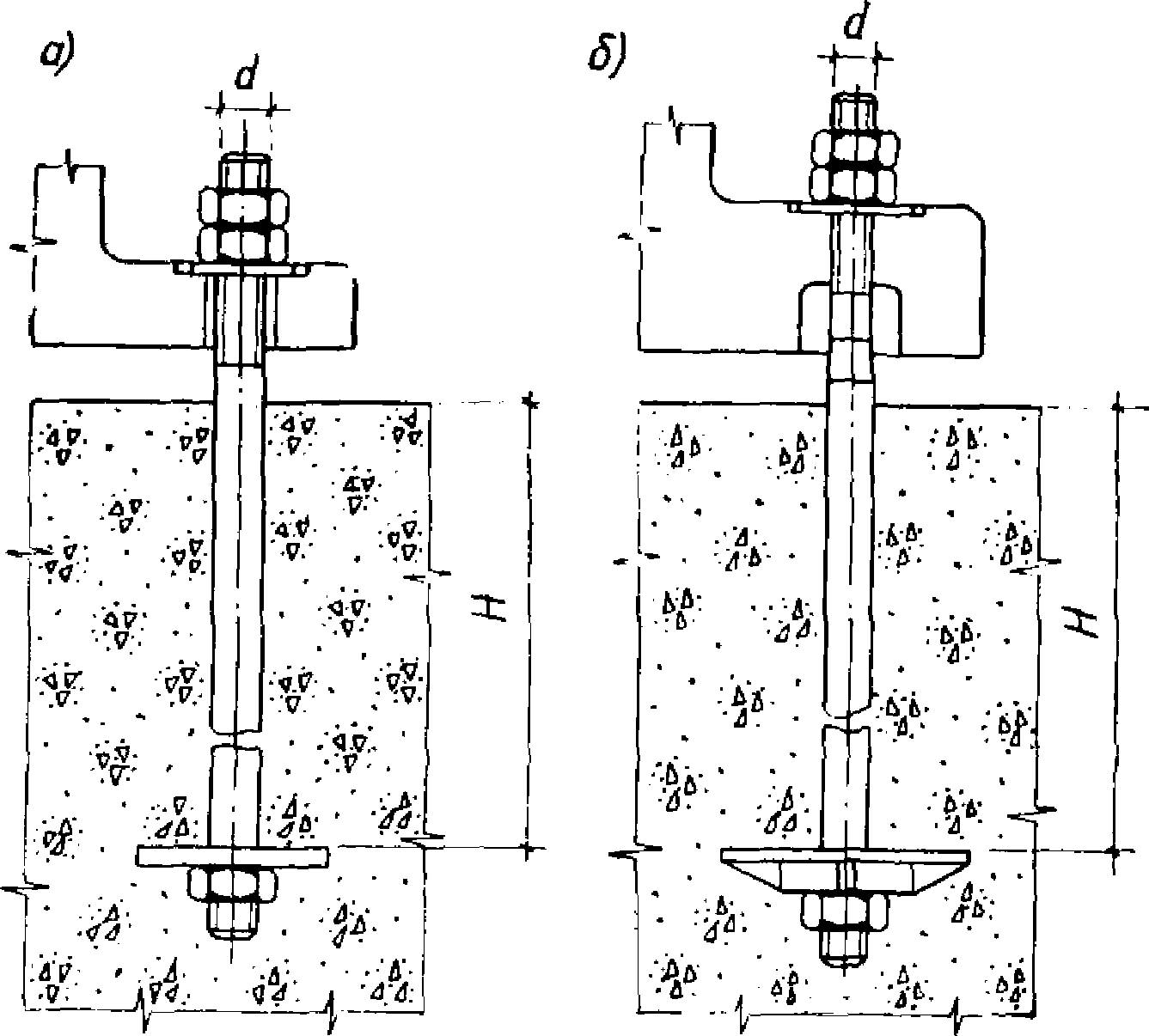 Болты с анкерными плитами, имеющие меньшую глубину заделки в бетон по сравнению с болтами с отгибами, должны применяться в случаях, когда высота фундамента определяется глубиной заделки болтов в бетон.
