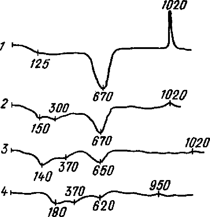 Каолинит. Кривая нагревания каолинита характеризуется значительным эндоэффектом с максимумом в интервале 550 - 610 °C (в зависимости от степени окристаллизованности частиц) и экзотермическим эффектом с максимумом в интервале 925 - 1020 °C. Эндоэффект вызывается выделением гидроксильной воды и разрушением структуры минерала. Экзоэффект связан с кристаллизацией аморфных продуктов распада каолинита, образованием муллита