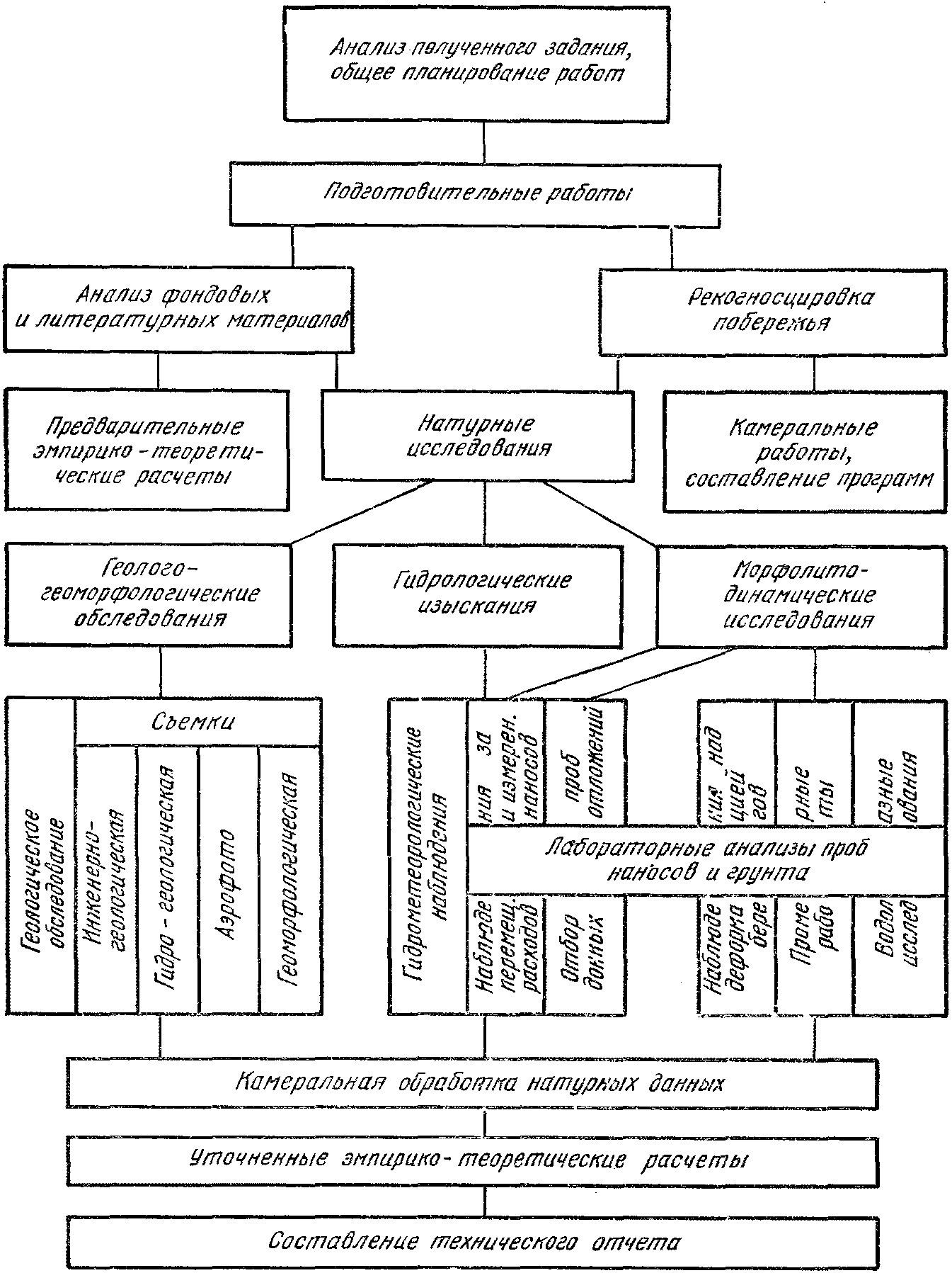 Наблюдения должны охватывать не только участок предполагаемого строительства, но и определенное протяжение берега в обе стороны от него. Если вдоль данного участка берега существует поток наносов, важно изучить процессы, начиная от основного источника питания и вплоть до участка аккумуляции наносов. Методы изысканий и исследований разнообразны. Работу начинают обычно с анализа материалов исследований прошлых лет и изучения топографических и гидрографических карт, желательно разных лет съемки. Сравнение последних может выявить существенные изменения за несколько десятилетий. Съемка на участке и промер глубин на акватории должны быть выполнены заново в нужном масштабе. Промер затем повторяется в различные сезоны, а также до и после шторма или штормового периода.