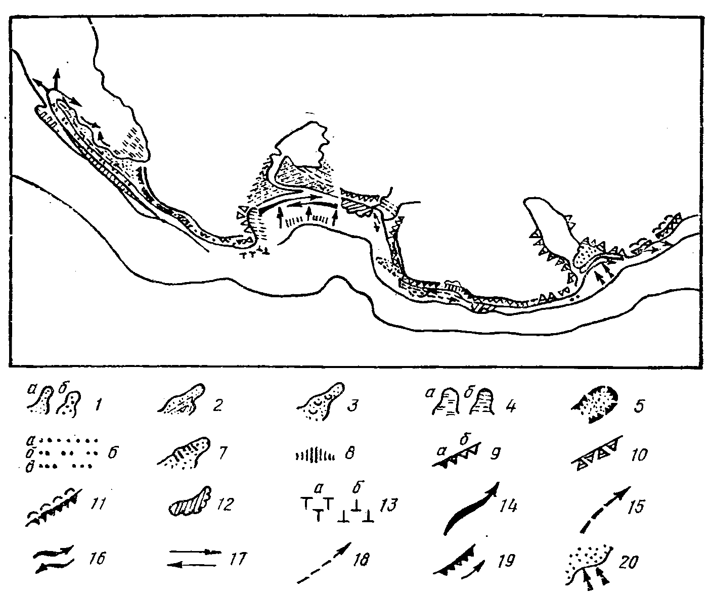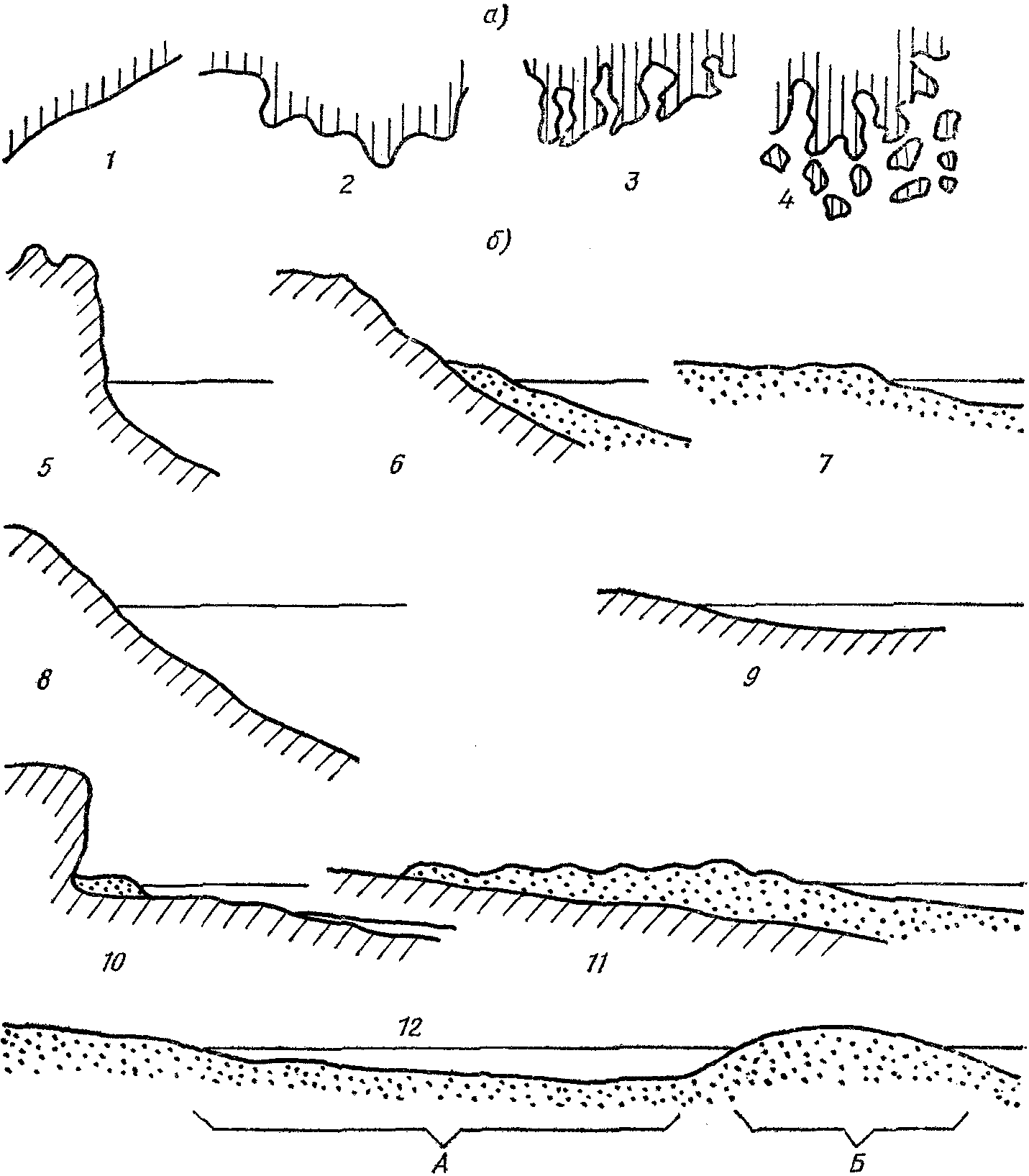 8 - приглубые, 9 - отмелые, 10 - абразионные,