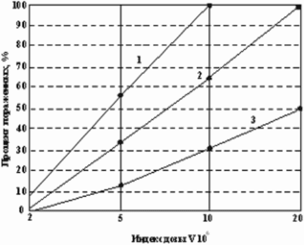 Данные о вероятности смертельного поражения в зависимости от полученного индекса дозы излучения I = q