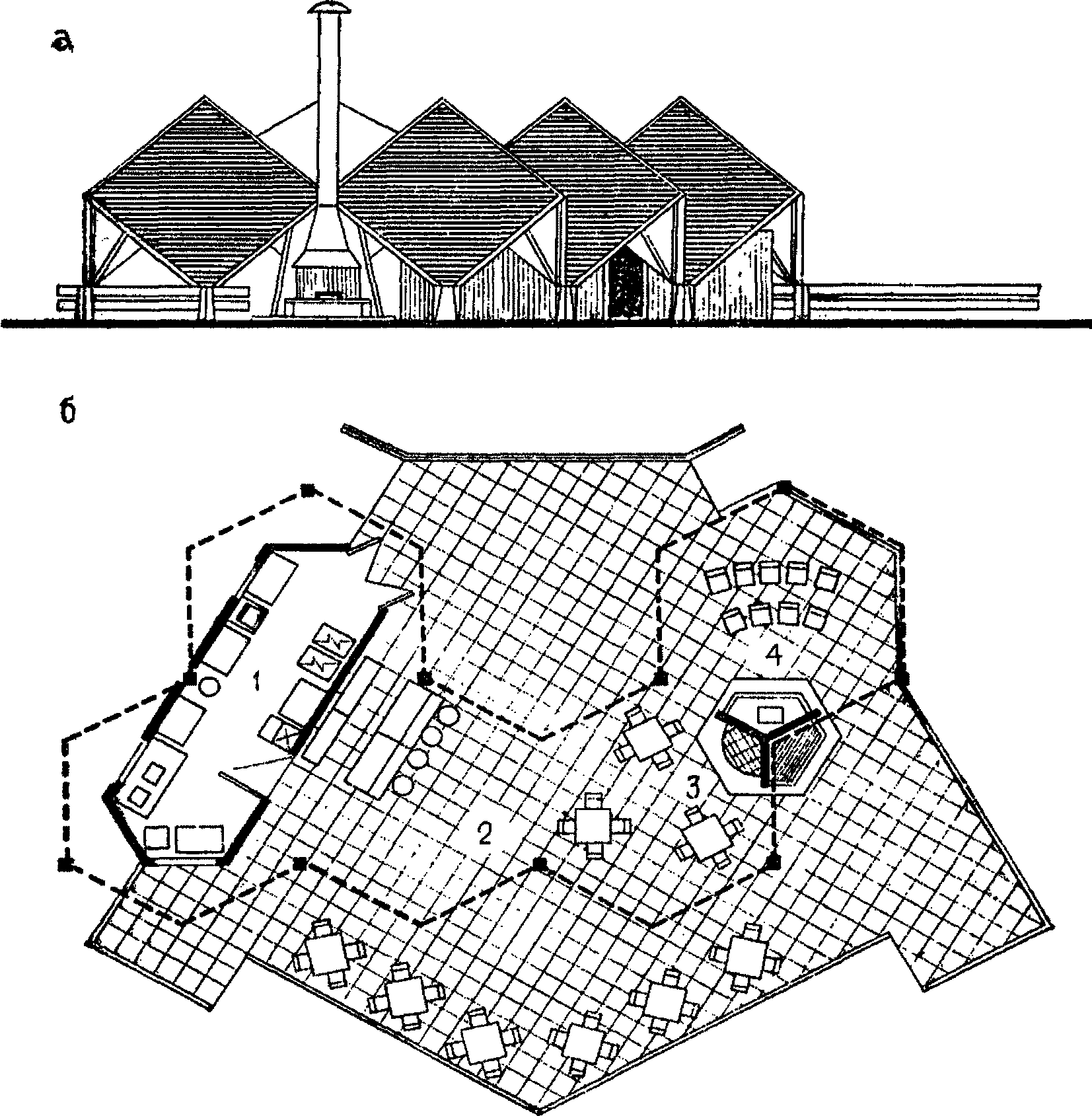 4.4. Для зданий и сооружений крупноячеистой структуры (залы столовых, спортивные корпуса, зрительные залы) с пролетом 9 - 18 м рекомендуется использовать клеевые деревянные балки, арки, фермы, а также металлические прутковые фермы и облегченные структуры в сочетании с ограждающими панельными конструкциями либо с применением листовых материалов: фанеры, плоского и волокнистого асбестоцемента или стеклопластика.