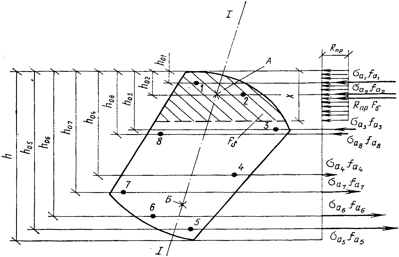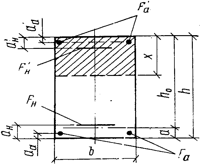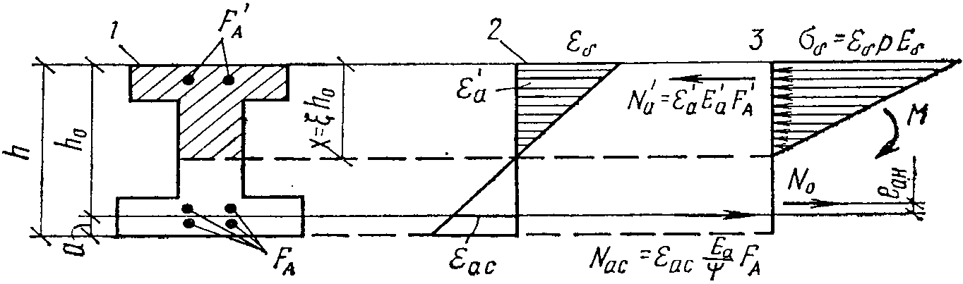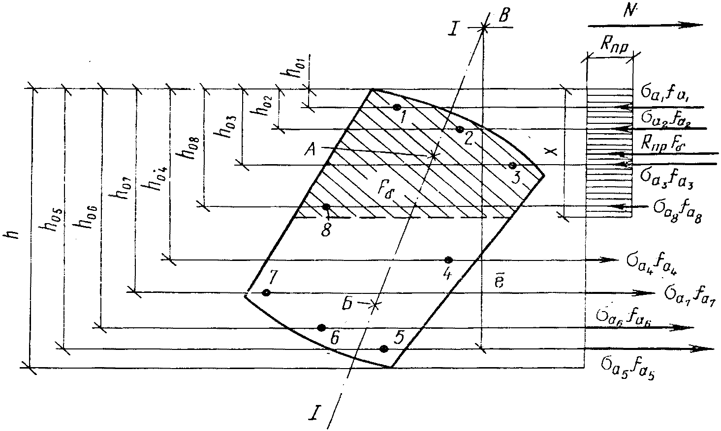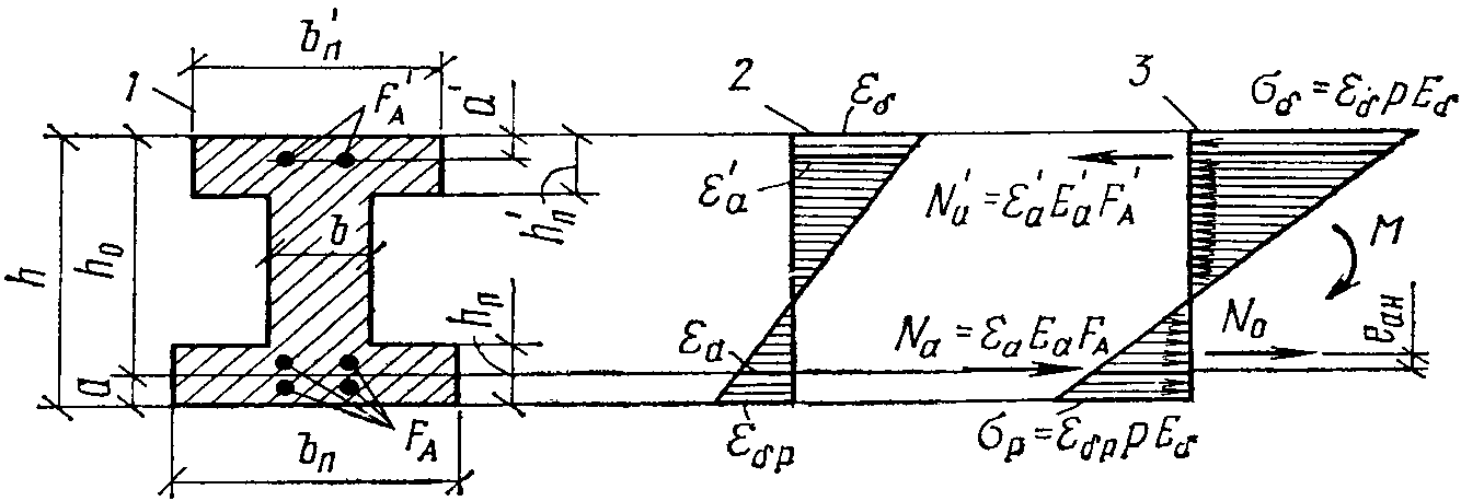 eа и eа.н - расстояние от точки приложения соответственно продольной силы N и усилия предварительного обжатия N0 до центра тяжести площади сечения арматуры A;