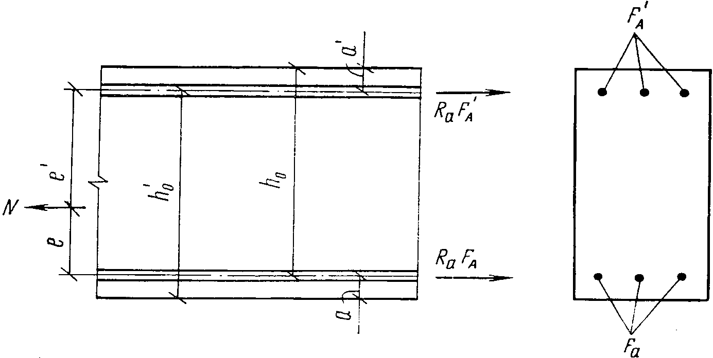 e и e' - расстояние от точки приложения продольной силы N до равнодействующей усилий соответственно в арматуре A и A';