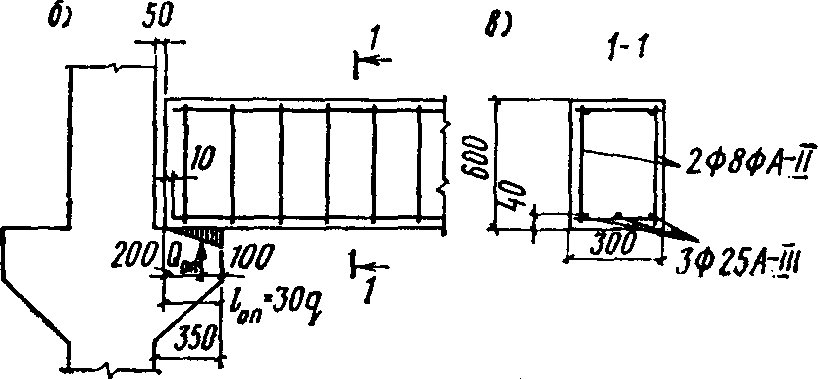 Закладные детали в бетонах на пористых заполнителях проектных марок 50 - 100 проектируются таким образом, чтобы отрывающие силы воспринимались нормальными анкерами, приваренными втавр, а сдвигающие силы - наклонными анкерами, приваренными внахлестку. Анкеры закладных деталей в этих бетонах рекомендуется принимать из арматурной стали периодического профиля класса А-II или из гладкой арматурной стали класса А-I диаметром не более 16 мм. На концах анкеров следует устраивать усиления в виде высаженных головок или приваренных пластин. Длина анкерных стержней и размеры усиления определяются расчетом на выкалывание и смятие бетона. При этом длина анкера принимается не менее 15d, а диаметр высаженной головки - не менее 3d.