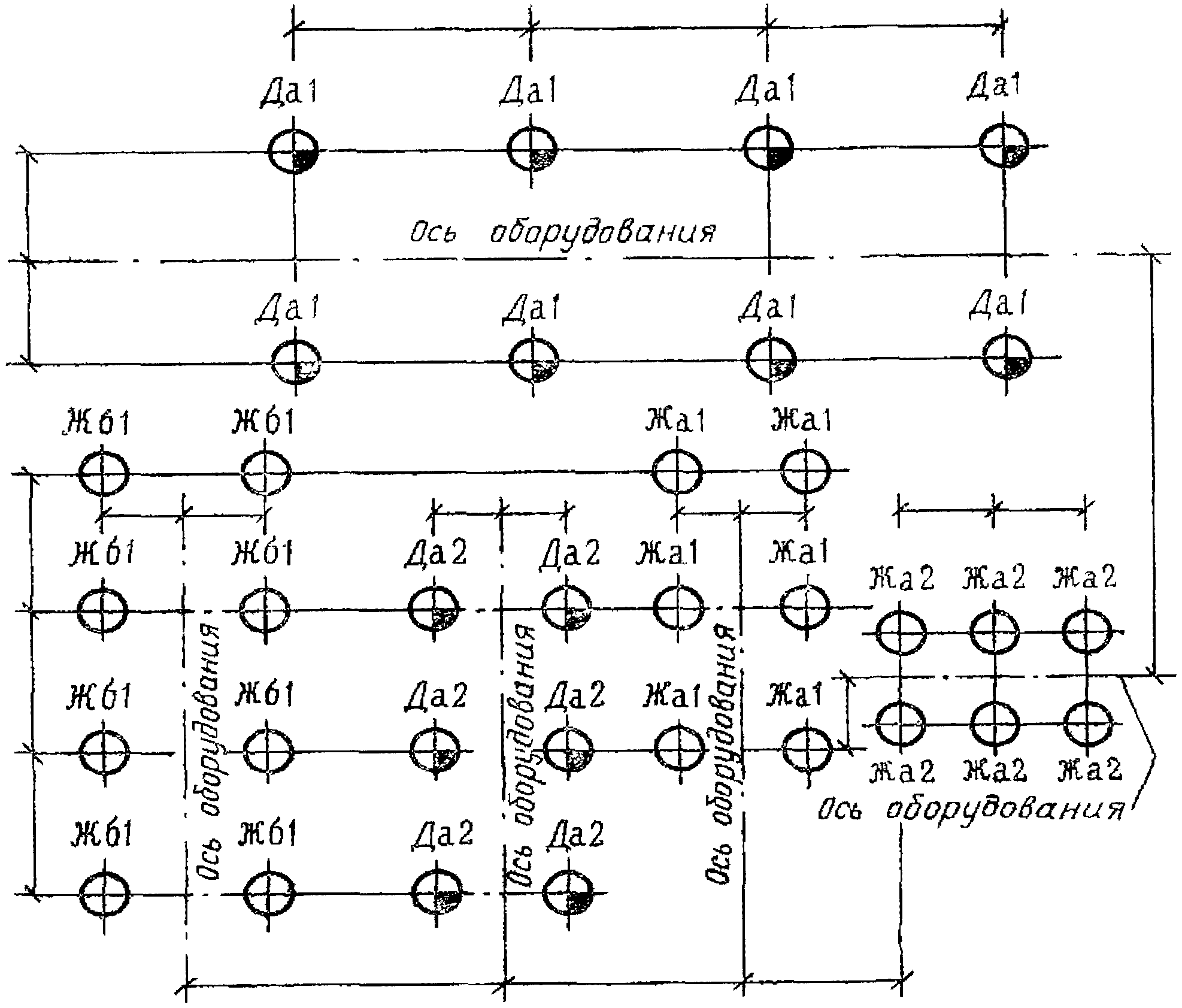 Оси оборудования обозначают арабскими цифрами, причем вертикальные по плану обозначают нечетными цифрами, а горизонтальные - четными.