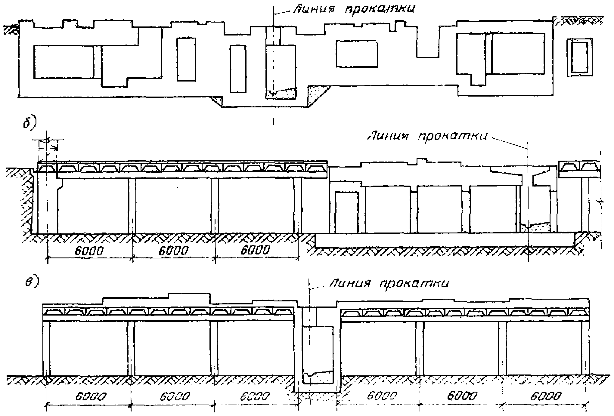 с устройством технических этажей при поднятой линии прокатки или других технологических линий (сварки, прошивки) с исключением подвальных помещений (рис. 1, в).
