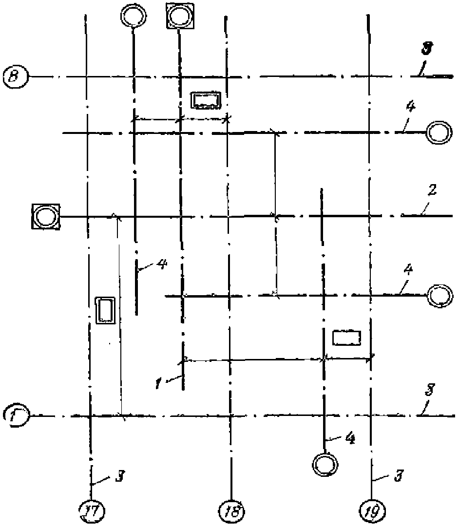 3 - разбивочные оси здания; 4 - разбивочные оси оборудования