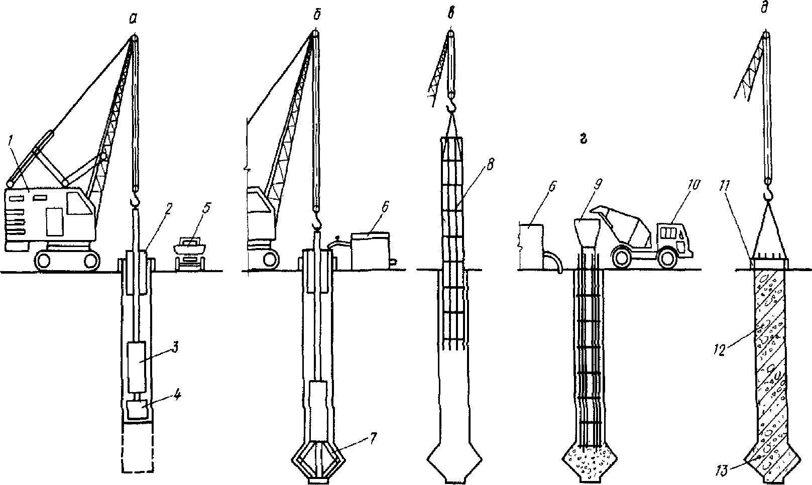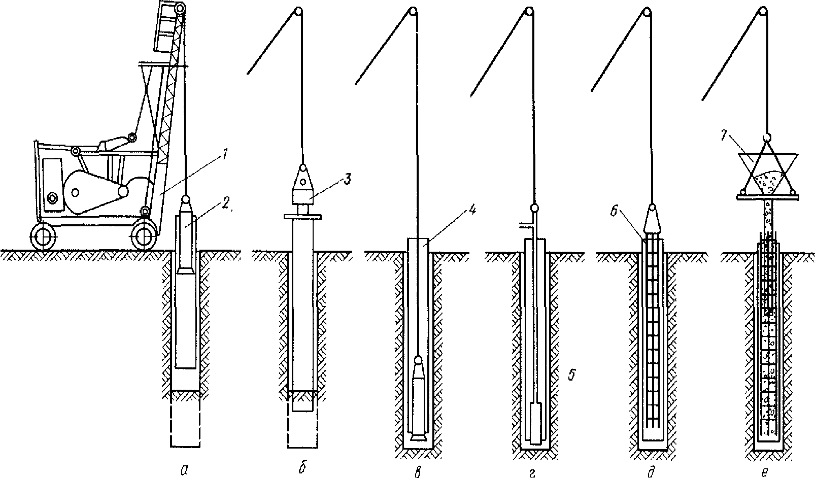каркаса; е - заполнение скважины бетоном; 1 - буровая