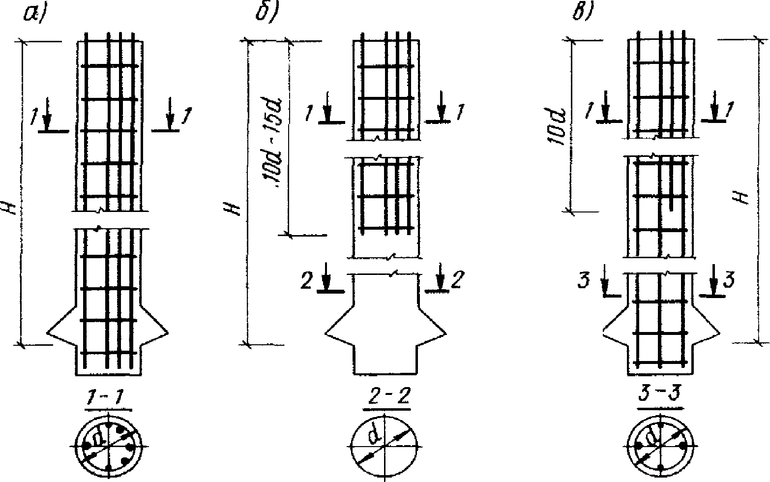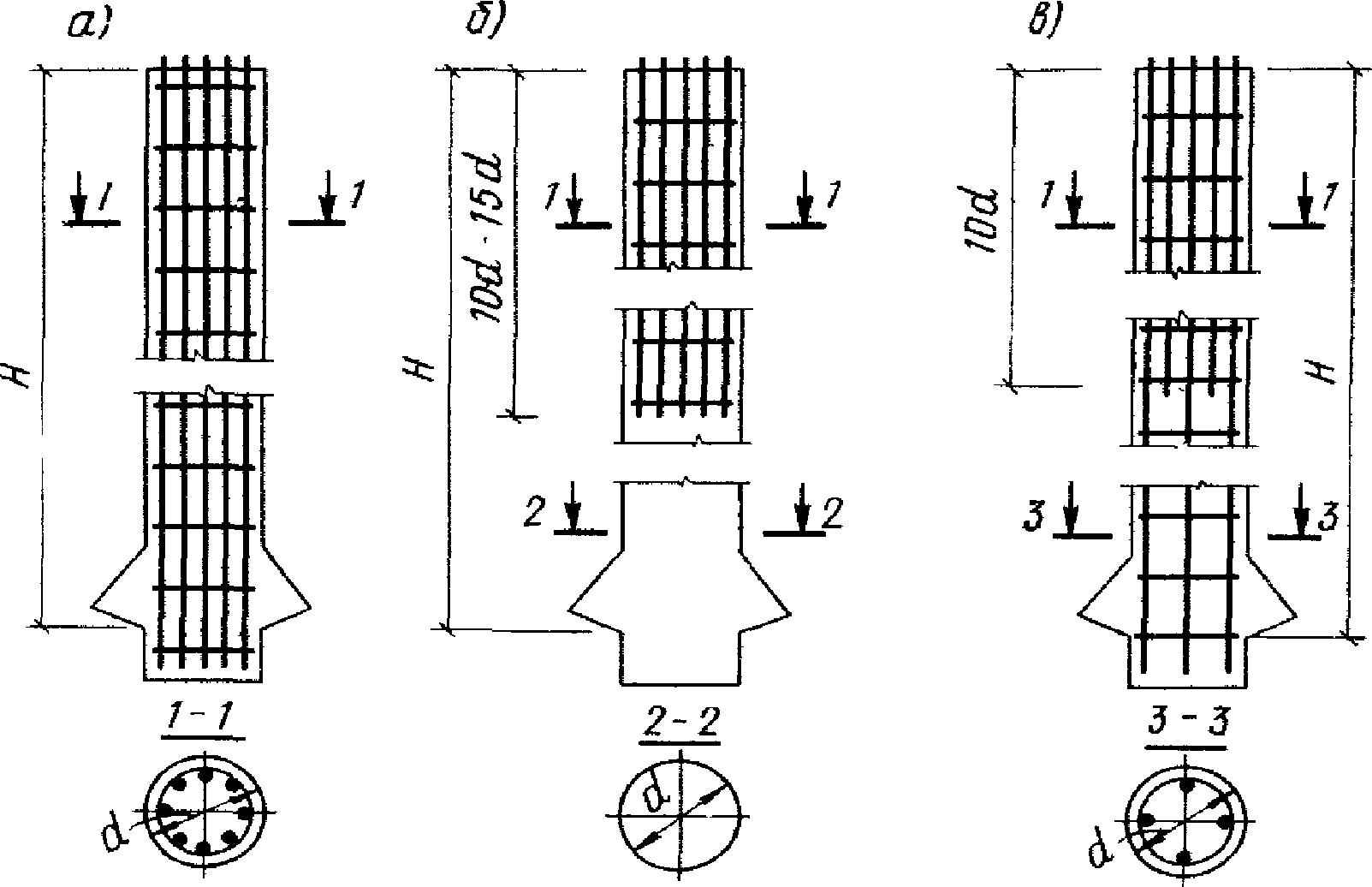 1.4. Буронабивные сваи подпорных сооружений следует, как правило, изготовлять без уширения пяты с сосредоточенным армированием (концентрацией продольной рабочей арматуры в зонах наибольших сжимающих и растягивающих усилий поперечных сечений свай) и с неравномерным армированием по длине ствола - частично оборванными продольными стержнями арматурных каркасов в соответствии с эпюрами изгибающих моментов.