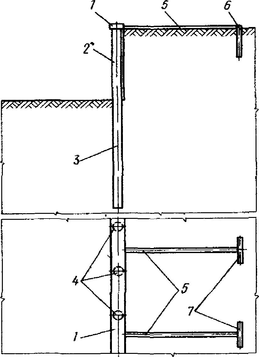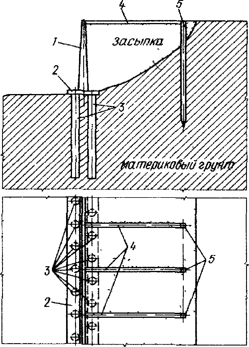 3 - свайный ряд; 4 - сваи; 5 - горизонтальный анкер;