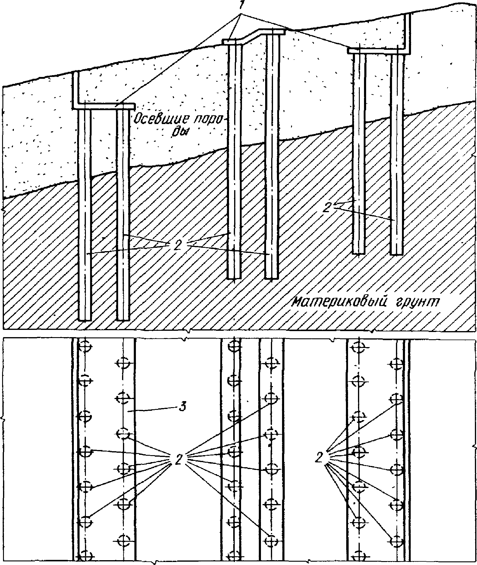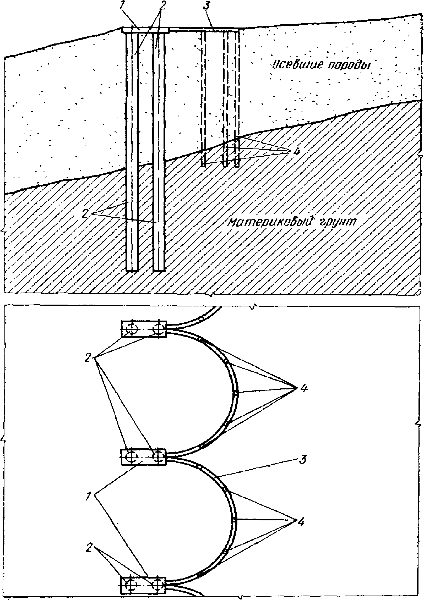 1 - объединяющий ростверк; 2 - сваи; 3 - линия скольжения