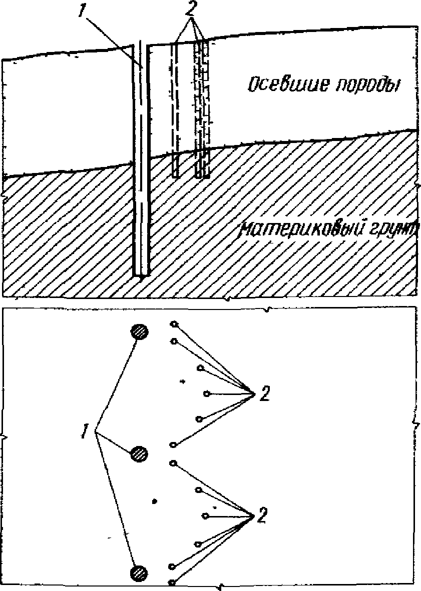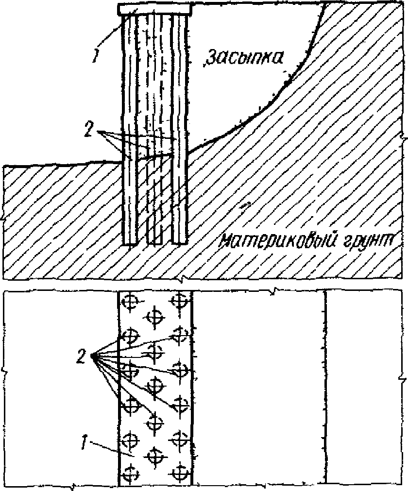 1 - буронабивные сваи; 2 - грунтонабивные сваи