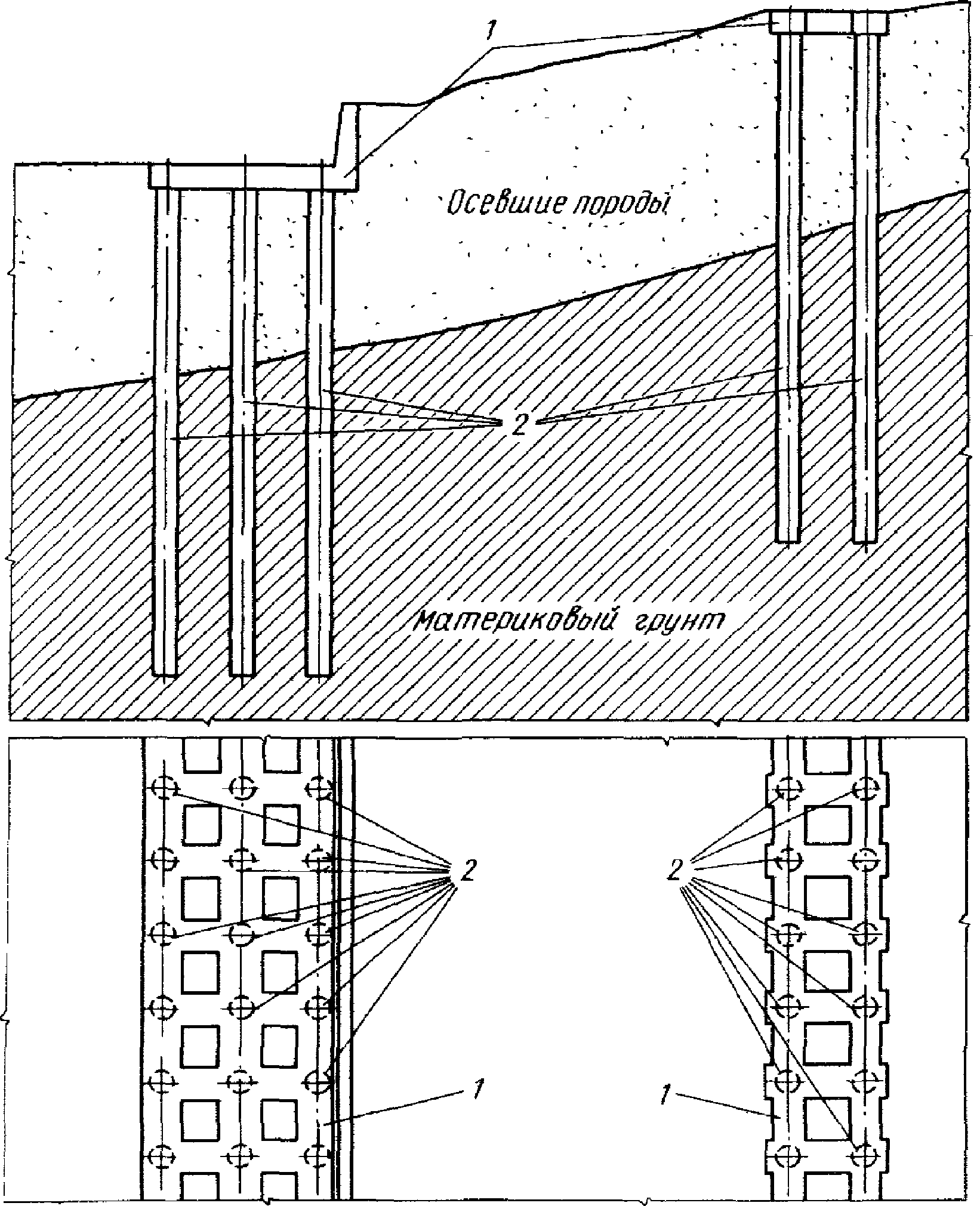 1 - объединяющий ростверк; 2 - железобетонная забирка;