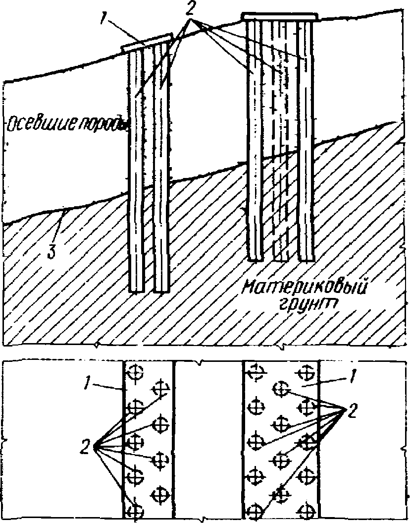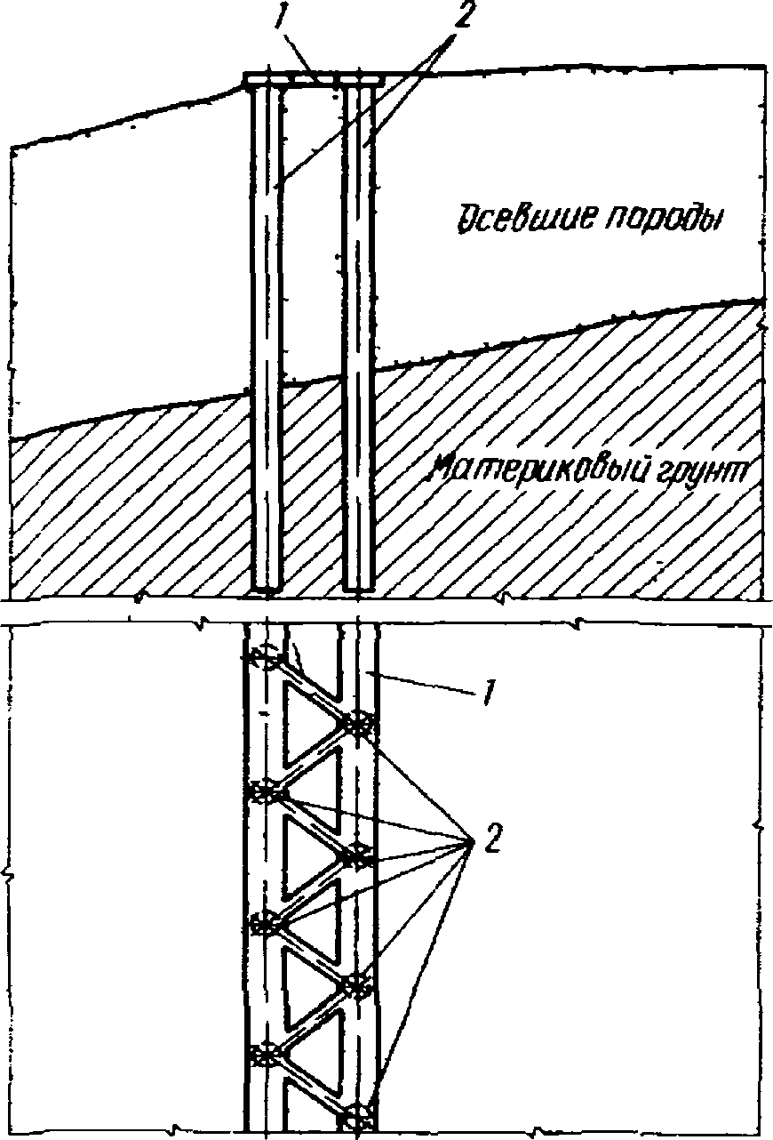 Рис. 9. Двухъярусное свайное заграждение из двухрядных