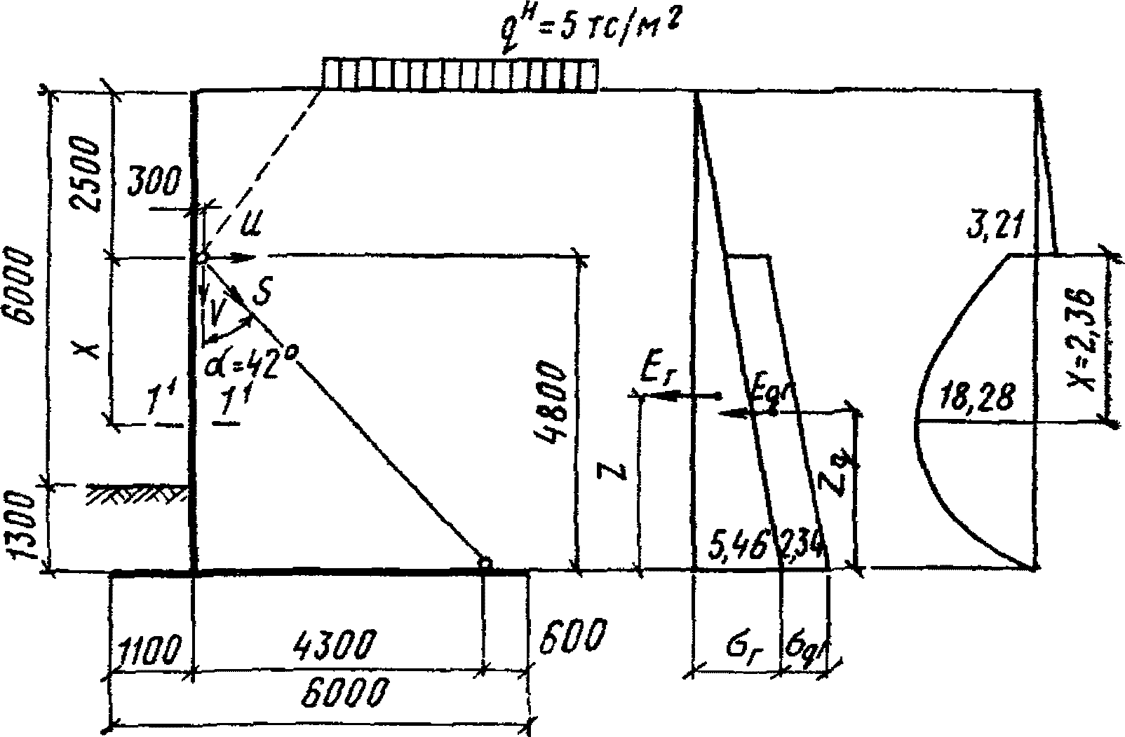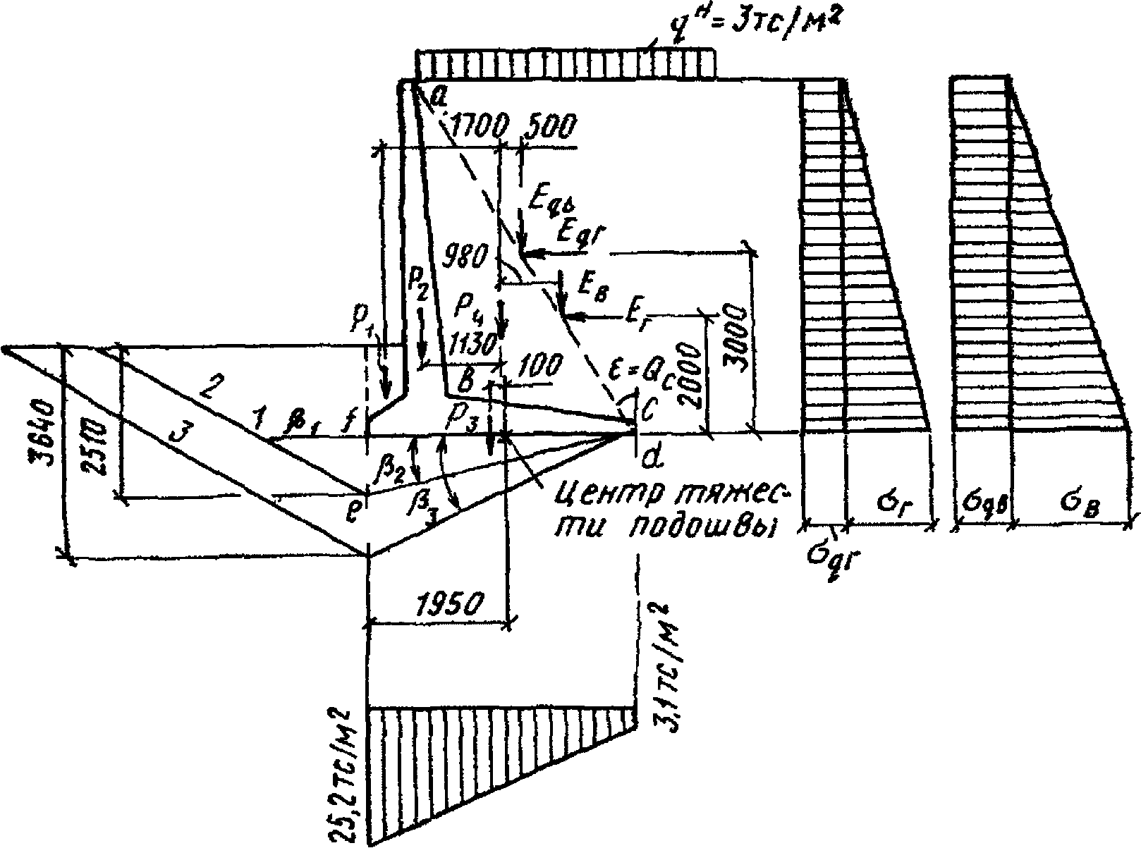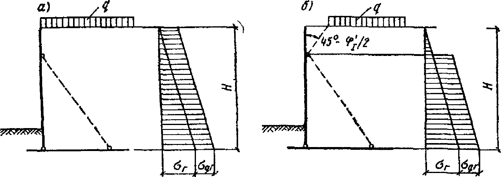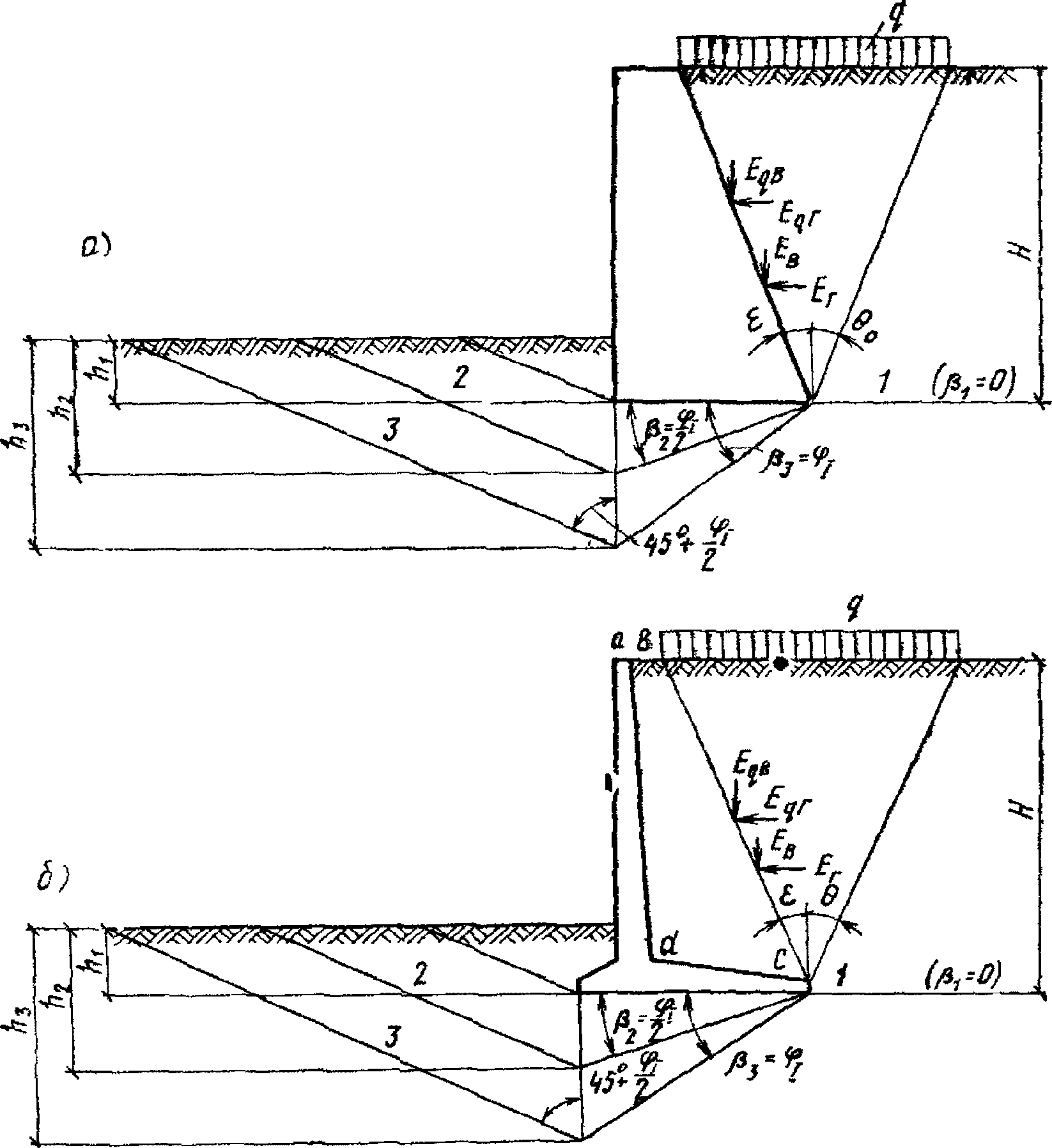 При наличии наклонной в сторону от засыпки тыльной грани в работу подпорной стены включается масса грунта, расположенного над этой гранью. В стенах с двумя наклонными в сторону засыпки гранями интенсивность горизонтального давления грунта уменьшается, но возведение стен такого сечения является более сложным.