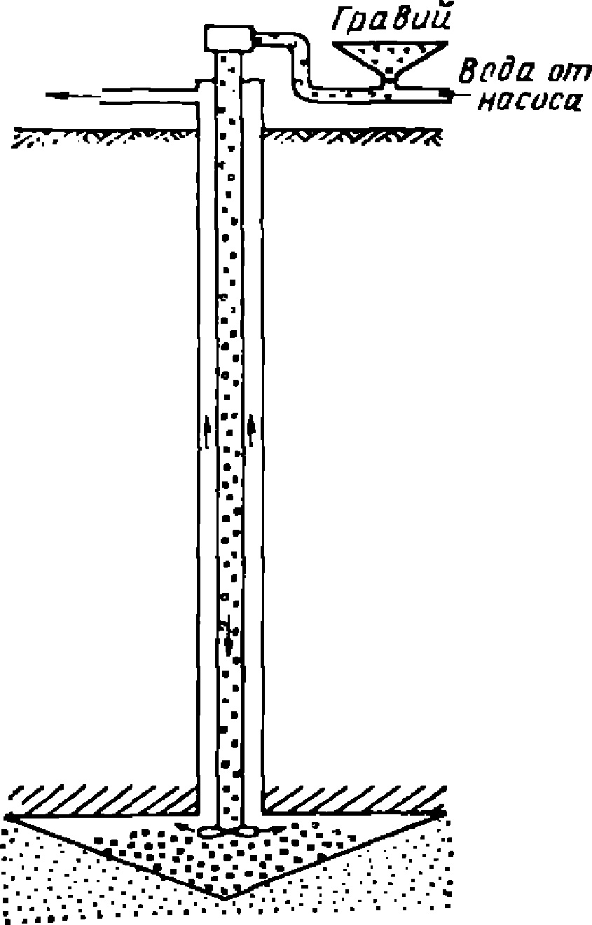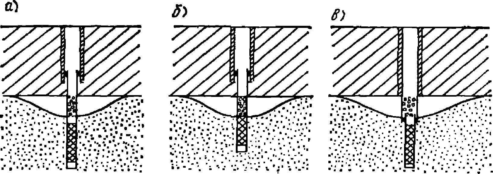 Бесфильтровые скважины в рыхлых породах сооружаются в напорных песчаных водоносных горизонтах, перекрытых устойчивыми породами. Водоприемной частью в них служит воронкообразная полость в верхней части песчаного пласта, через откосы которой вода поступает в скважину. Устойчивость водоприемной полости обеспечивается крепостью пород кровли, естественными углами образующихся фильтрующих песчаных откосов и оптимальным режимом откачки. В результате отпадает необходимость в изготовлении и установке фильтра, повышается производительность и увеличивается срок ее службы. Все это в итоге уменьшает затраты на единицу продукции - кубометр воды.