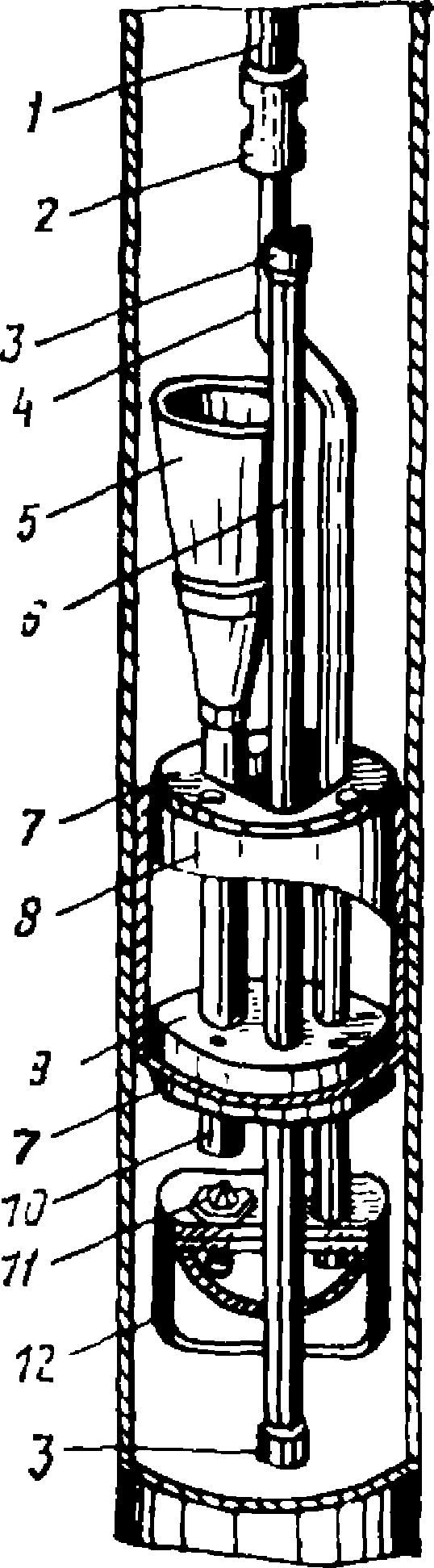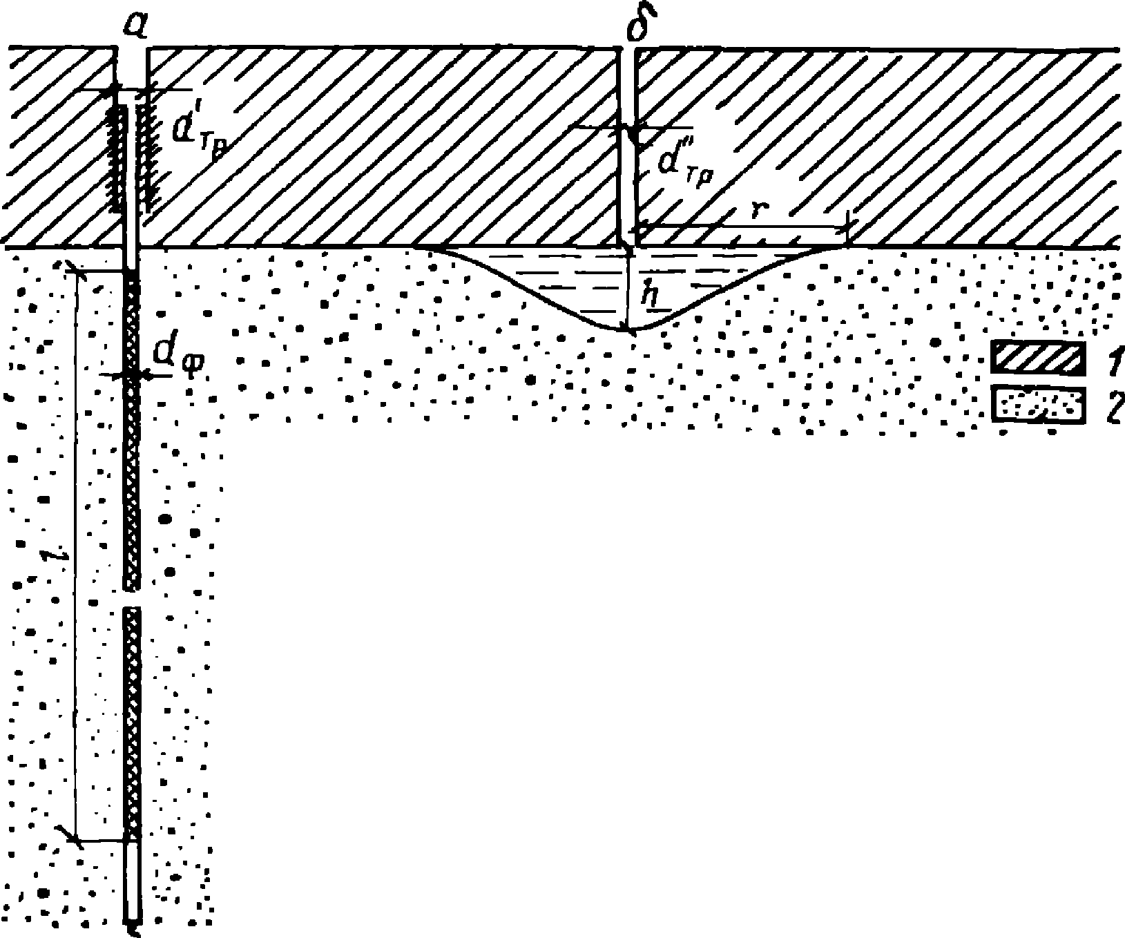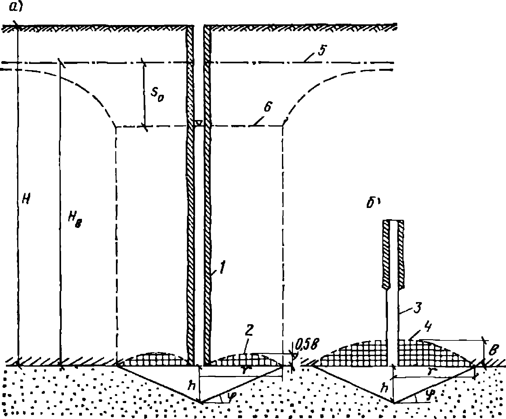 1.2. Из конструктивных особенностей рассматриваемых типов бесфильтровых скважин видны некоторые ограничения по их применению. Они могут сооружаться только в напорных водоносных горизонтах. Снижение напора в процессе эксплуатации допускается почти до кровли воронки, но осушение воронки и пласта исключается. Погружной насос должен устанавливаться выше полости. Значительное снижение гидростатического напора в скважине уменьшает давление, поддерживающее снизу кровлю над воронкой. При недостаточно прочной и маломощной кровле, неглубоком ее залегании, в случае ее деформации существует вероятность просадок земной поверхности у устья скважины. Эти обстоятельства следует учитывать при проектировании.