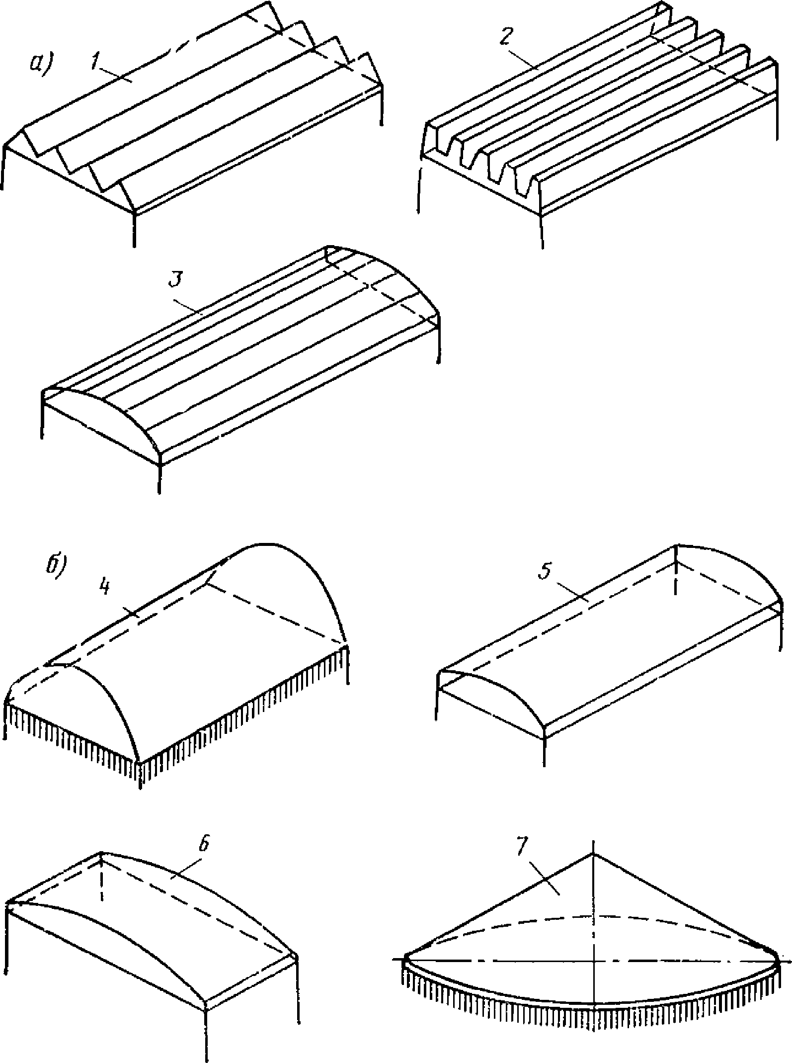 а) складки с различной формой поперечного сечения, в том числе призматические выпуклые, а также складчатые своды;