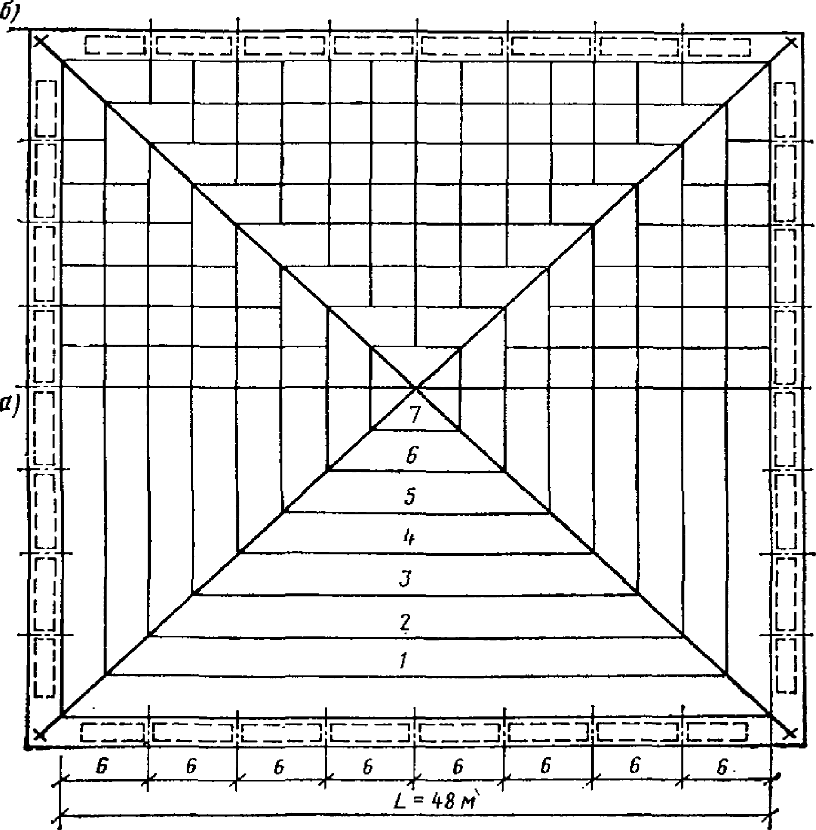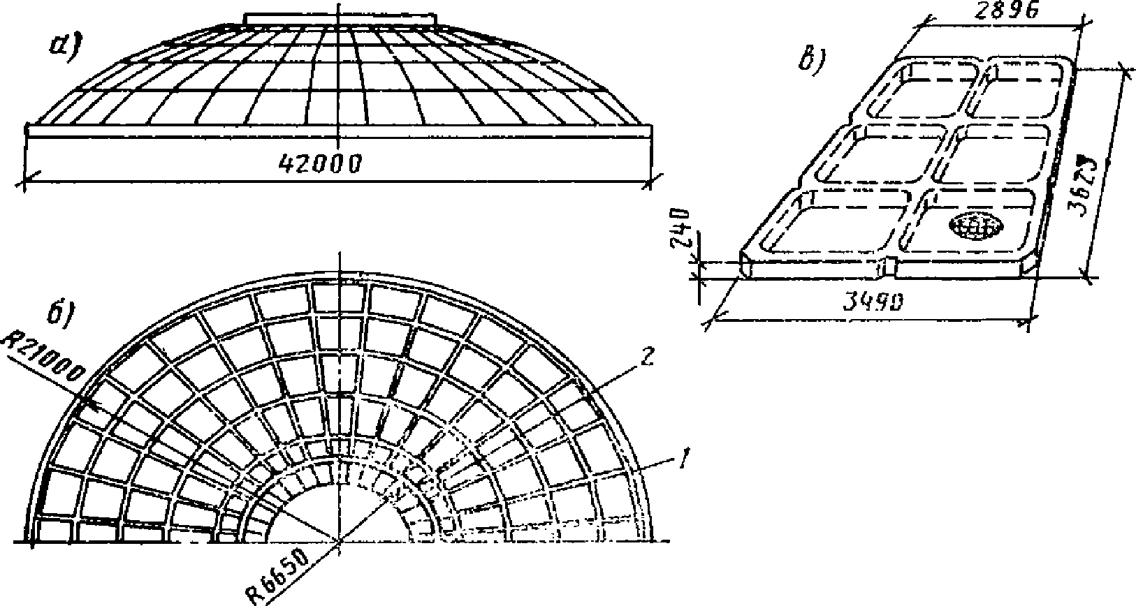 6 - то же, короткие; 7 - коническая оболочка; 8 - купол;