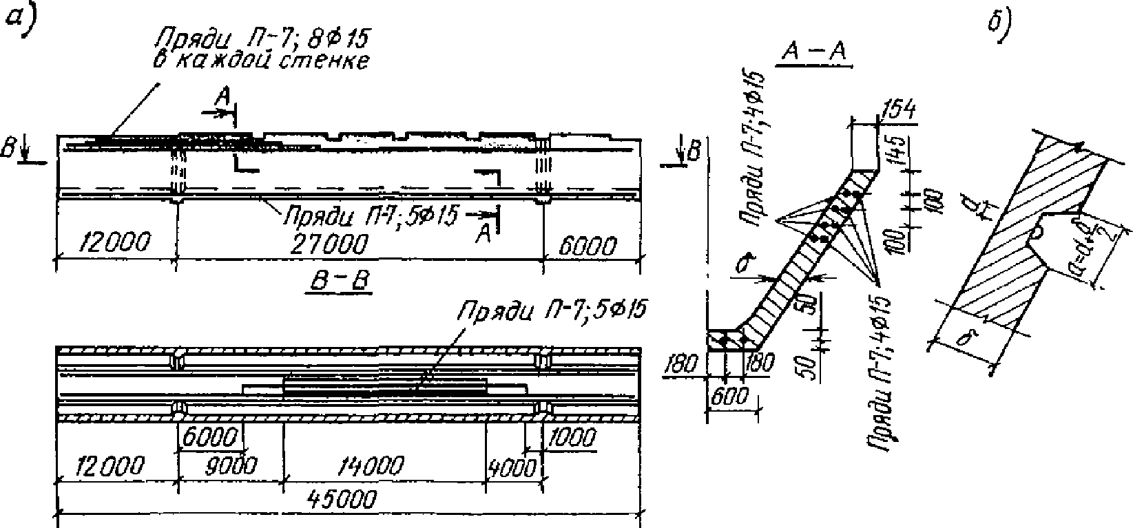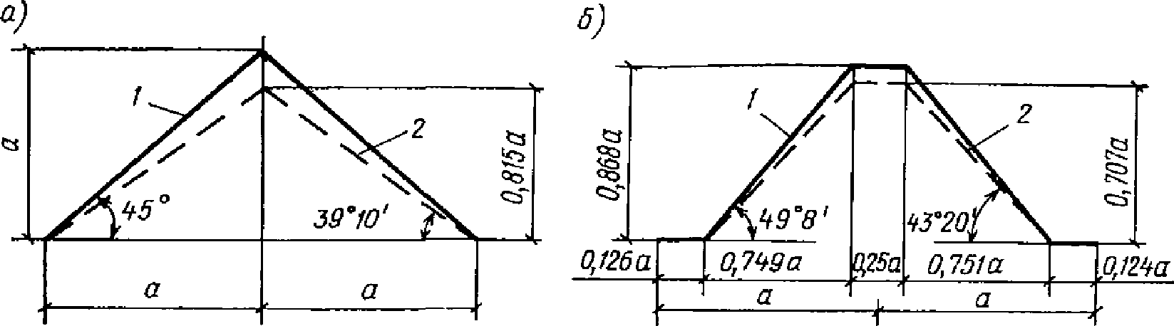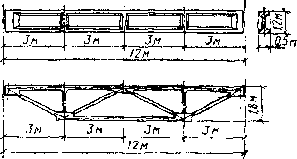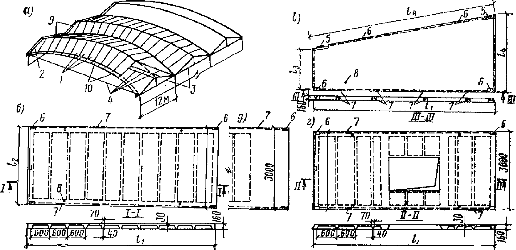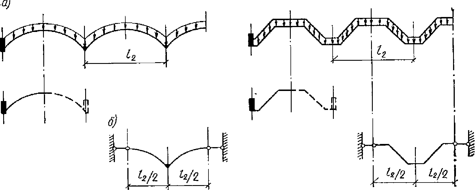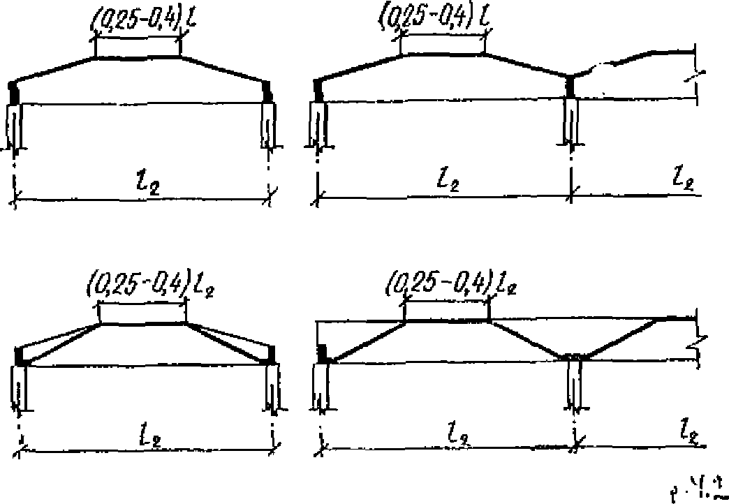 м - неразрезные оболочки; 1 - балочная складка с треугольным