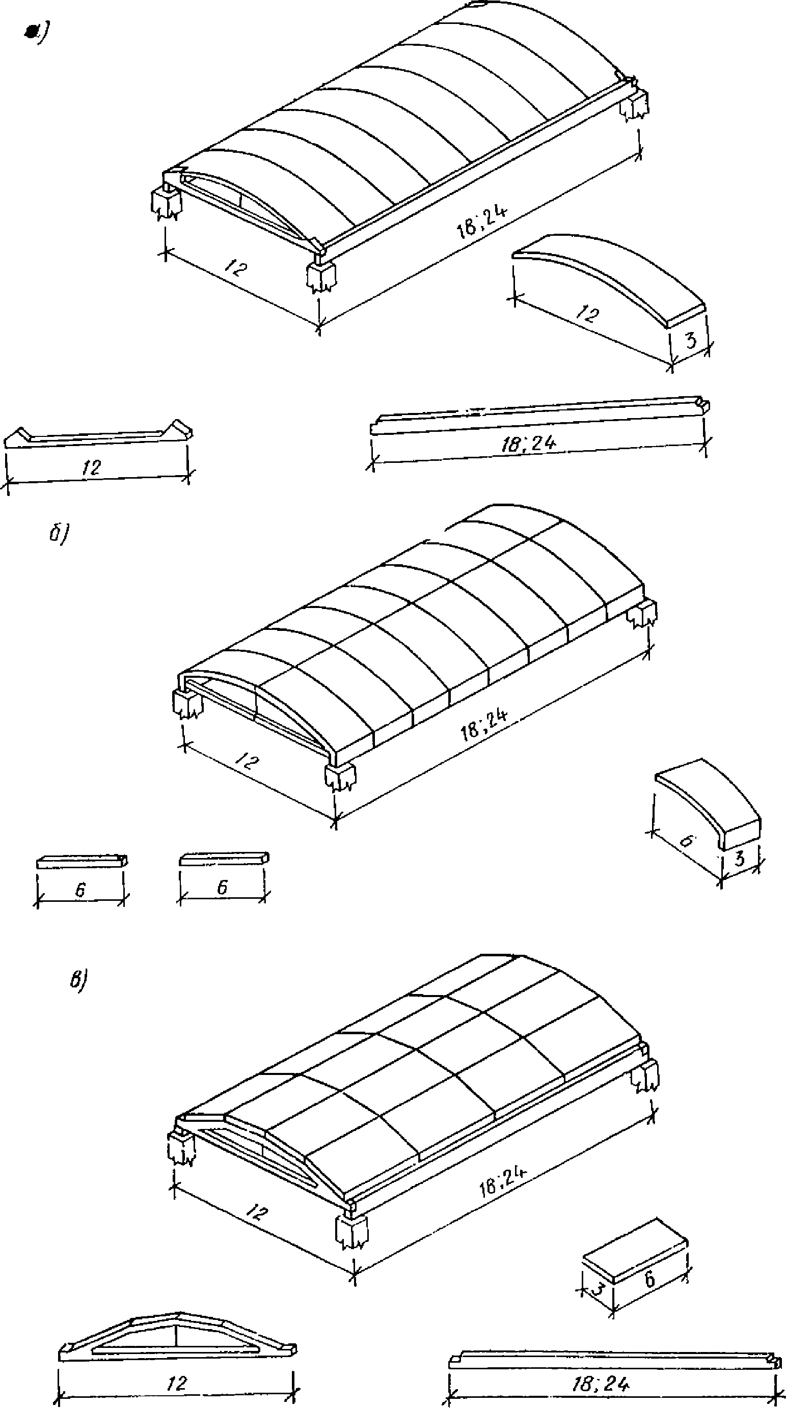оболочки; к - то же, из гиперболических треугольных сводов;
