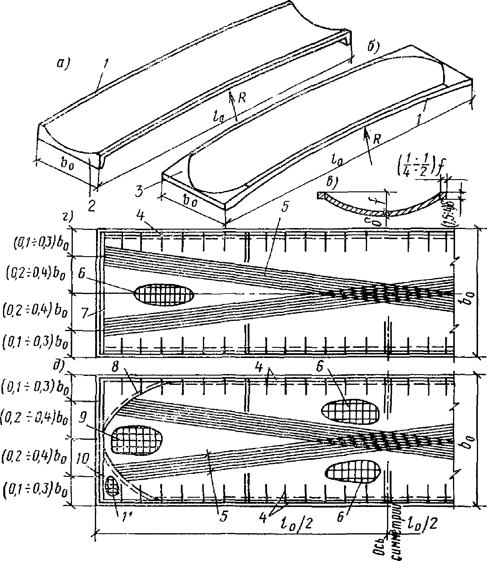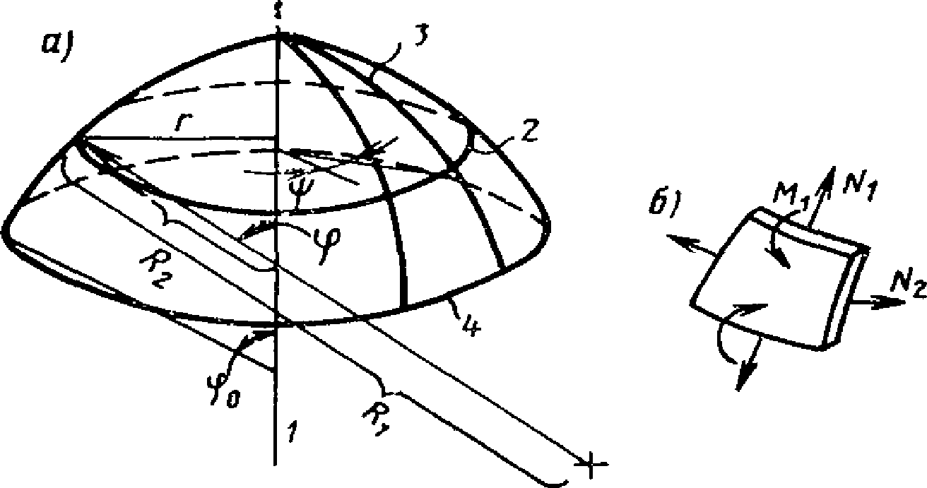 в) оболочки и волнистые своды положительной гауссовой кривизны - сферические оболочки и купола, очерченные по поверхностям вращения с вертикальной осью, тороидальные оболочки вращения с горизонтальной осью, бочарные своды и оболочки, очерченные по поверхности переноса в виде эллиптического параболоида, круговой поверхности, а также по выпуклой поверхности на плоском контуре;