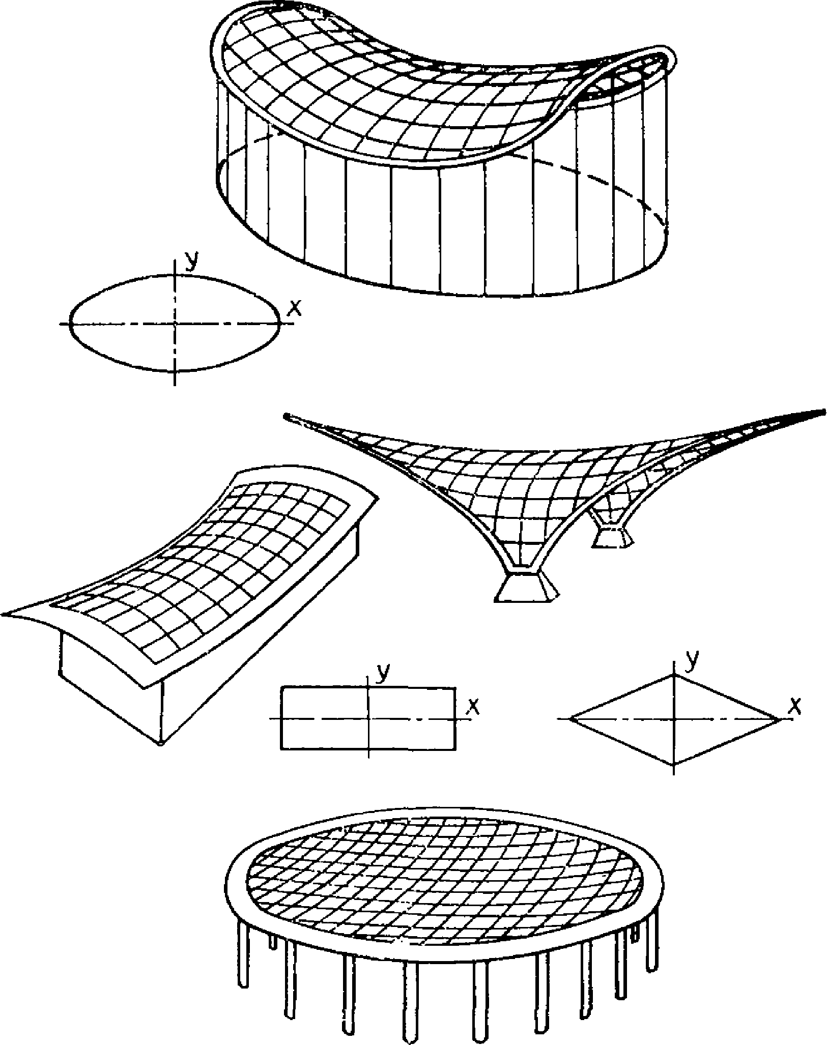 г) оболочки и волнистые своды отрицательной гауссовой кривизны - оболочки, очерченные по линейчатым поверхностям гиперболического параболоида (гипары) и по поверхностям вращения с горизонтальной или вертикальной осью;