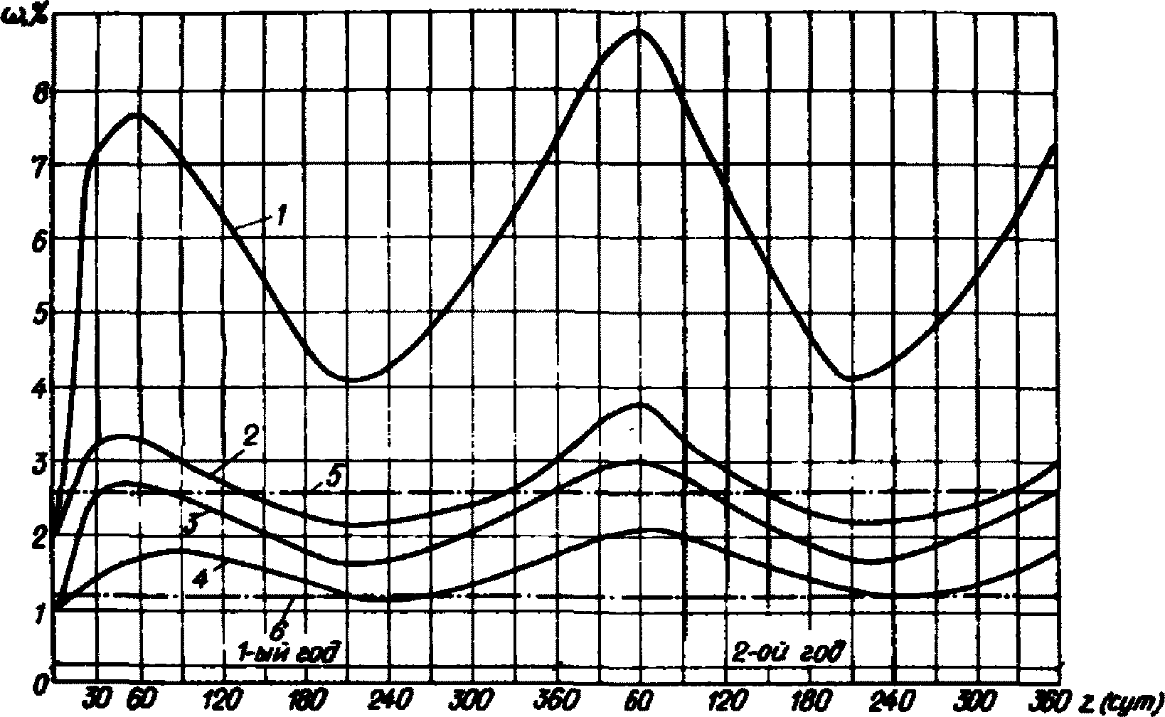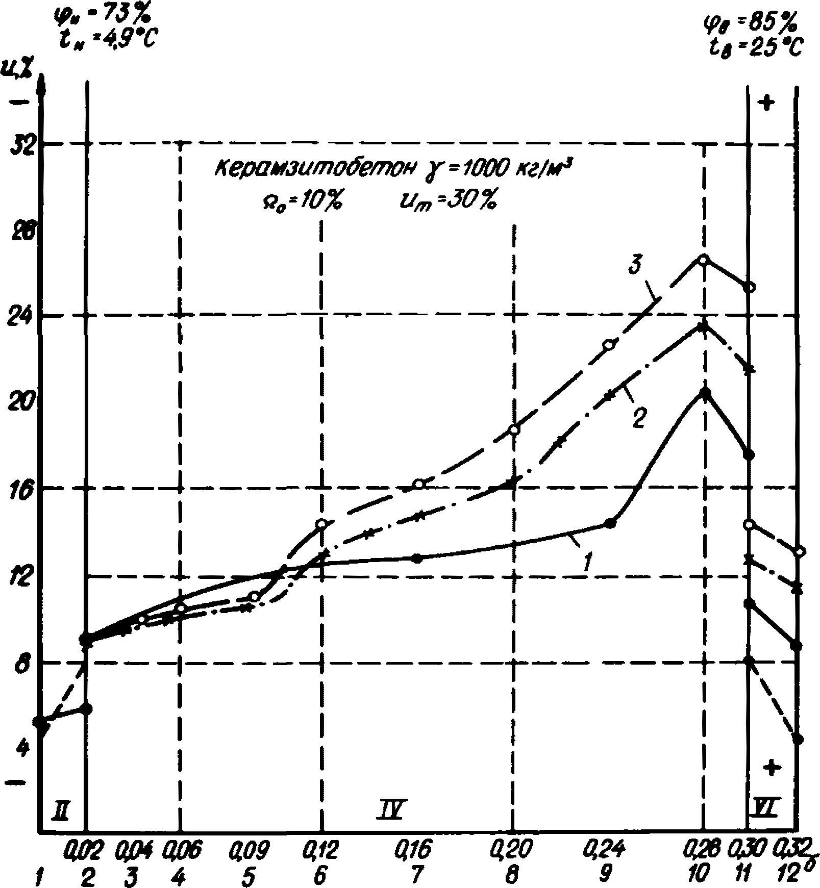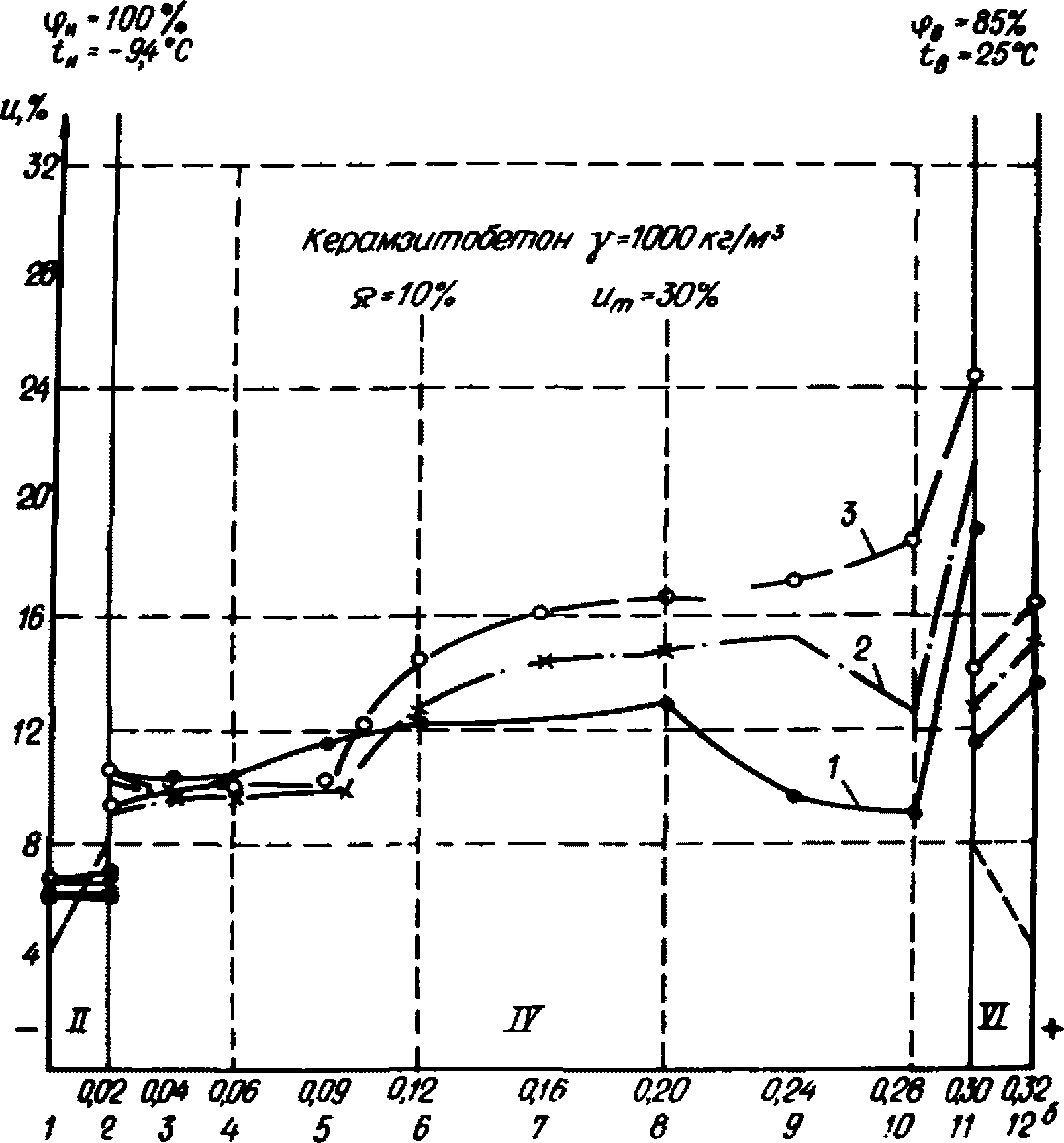 Усовершенствованный метод последовательного увлажнения апробирован и дает возможность с достаточной для практики точностью исследовать влажностное состояние материалов конструкций. Кроме того, он позволяет учитывать слои пароизоляции, расположенные внутри ограждения, а также зависимости характеристик влагопереноса материалов от их влажности. Программа для ЭВМ разработана только для решения одномерных задач по распределению влажности в ограждении. Однако этим методом принципиально возможно рассчитывать двухмерные влажностные поля. Исходные данные, необходимые для расчетов, имеют четко определенный физический смысл. Накоплено значительное количество экспериментальных влажностных характеристик строительных материалов, обобщение которых позволило составить таблицы расчетных характеристик, представленных в приложении. Большое внимание при составлении программы для ЭВМ было уделено удобству задания исходных данных.