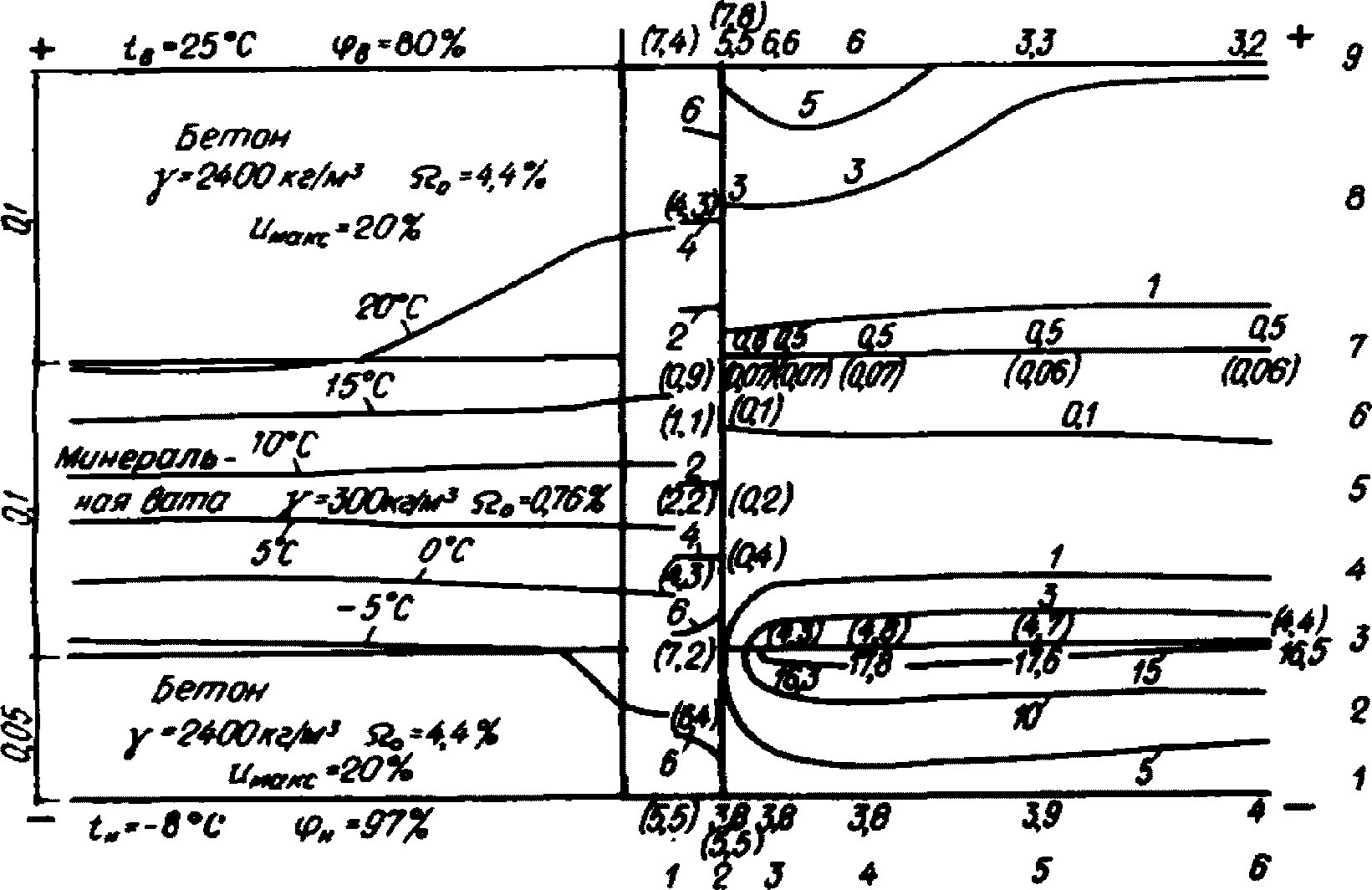 Использование первого, достаточно сложного метода расчета влажностного состояния материалов ограждающих конструкций дает возможность определять двухмерные влажностные поля, например, в зоне стеновых соединений панелей, влажностное состояние материалов ограждений с вентилируемыми прослойками. Кроме того, при расчете учитывается количество замерзшей влаги в порах материала. Экспериментальные методики определения характеристик влагопереноса материалов, требующихся для проведения расчетов по этому методу, в настоящее время не достаточно разработаны. Поэтому расчетные характеристики строительных материалов приняты на основании соответствующей обработки имеющихся данных и в последующем будут уточнены и откорректированы.