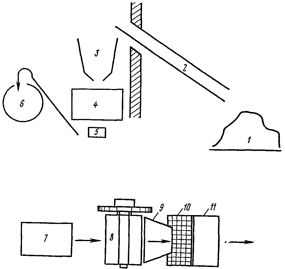 со склада 1 глину влажностью около 20% по транспортеру 2 подают в бункер 3, где она оттаивает и размокает. Один раз в сутки глину выдают в приемный бак 4 вместимостью 375 л, в котором ее замешивают водным раствором поташа (