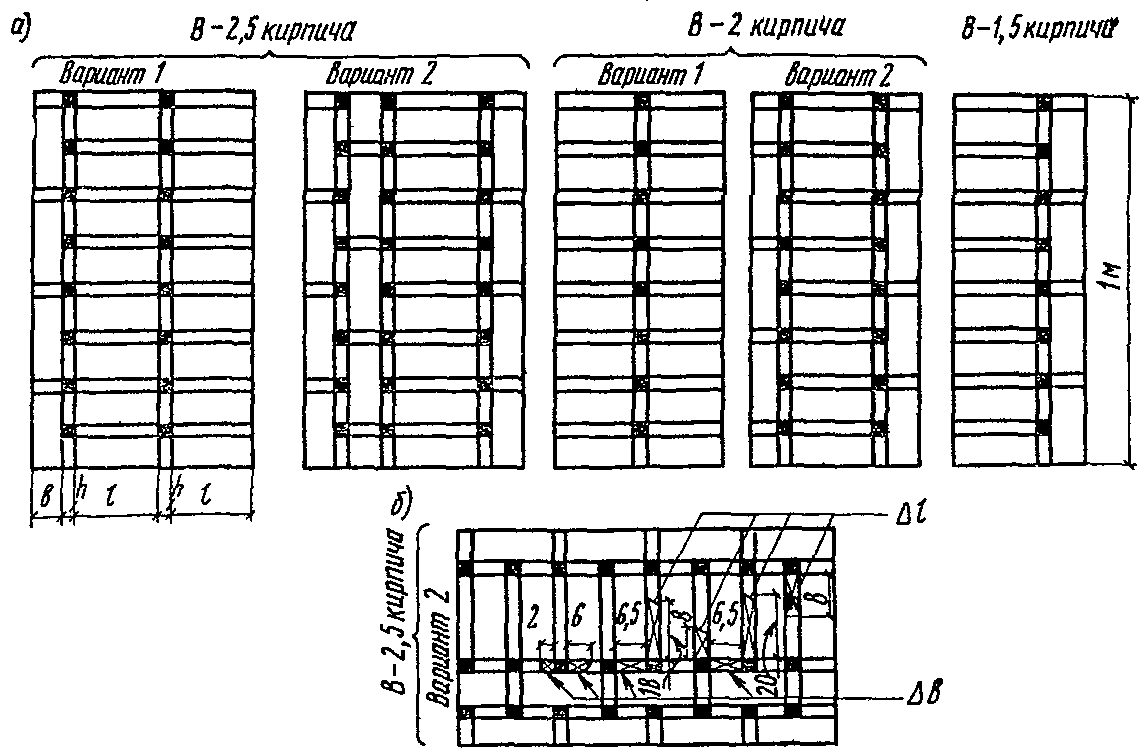 б) смачивание постелей кирпича непосредственно перед укладкой в дело, а также стенок ниш для бетонирования усилений, оставляемых в кладке, водным раствором поташа с добавкой кирпичной глины. Смачивание способствует более равномерному распределению контактов между раствором и камнем.