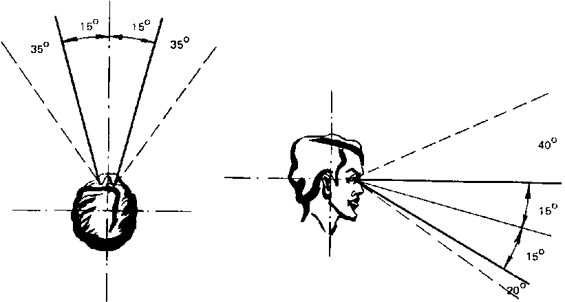 7.2.4.3. Цвета окраски опасных узлов и механизмов, средств транспорта, электропроводов, технологических коммуникаций, противопожарных устройств и др. относятся к сигнально-предупреждающим и отличительным цветам. Границы поля зрения для сигнально-предупреждающих цветов показаны на рис. 58. Опасные в отношении травматизма элементы оборудования, например, движущиеся механизмы и узлы технического оборудования, транспортные средства, а также наружные поверхности ограждений, не полностью закрывающие режущий инструмент или опасные части машин (ограждения фрез, циркулярных пил, приводов, абразивных кругов и т.д.), должны окрашиваться в соответствии с нормативными документами по технике безопасности <*>. При окраске травмоопасных транспортных средств рекомендуется применять цвета, близкие по своим характеристикам к желтому или оранжевому. Насыщенность и яркость применяемых цветов определяются необходимостью гармонического сочетания с типичными фонами. Наиболее опасные в отношении травматизма части транспортных средств рекомендуется окрашивать в желто-оранжевый цвет с черными полосами. Транспортные средства, окрашенные в цвета, не имеющие сигнально-предупреждающего значения, допустимо использовать лишь при отсутствии травмоопасности в целях гармоничного сочетания их окраски с цветовой гаммой оборудования и интерьера в целом при достаточном цветовом контрасте с фоном (строительные конструкции, природное окружение и т.д.).