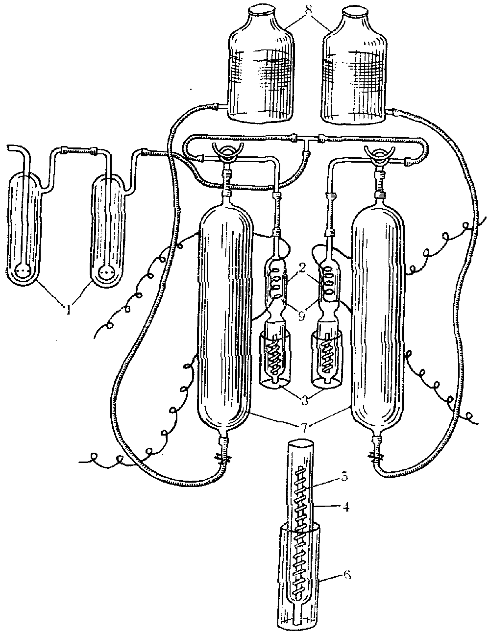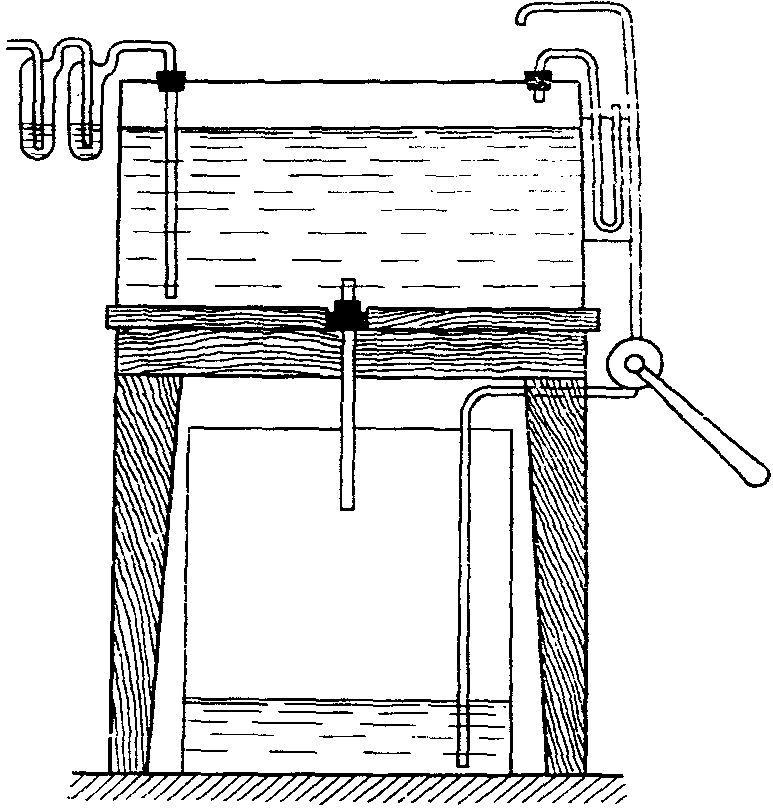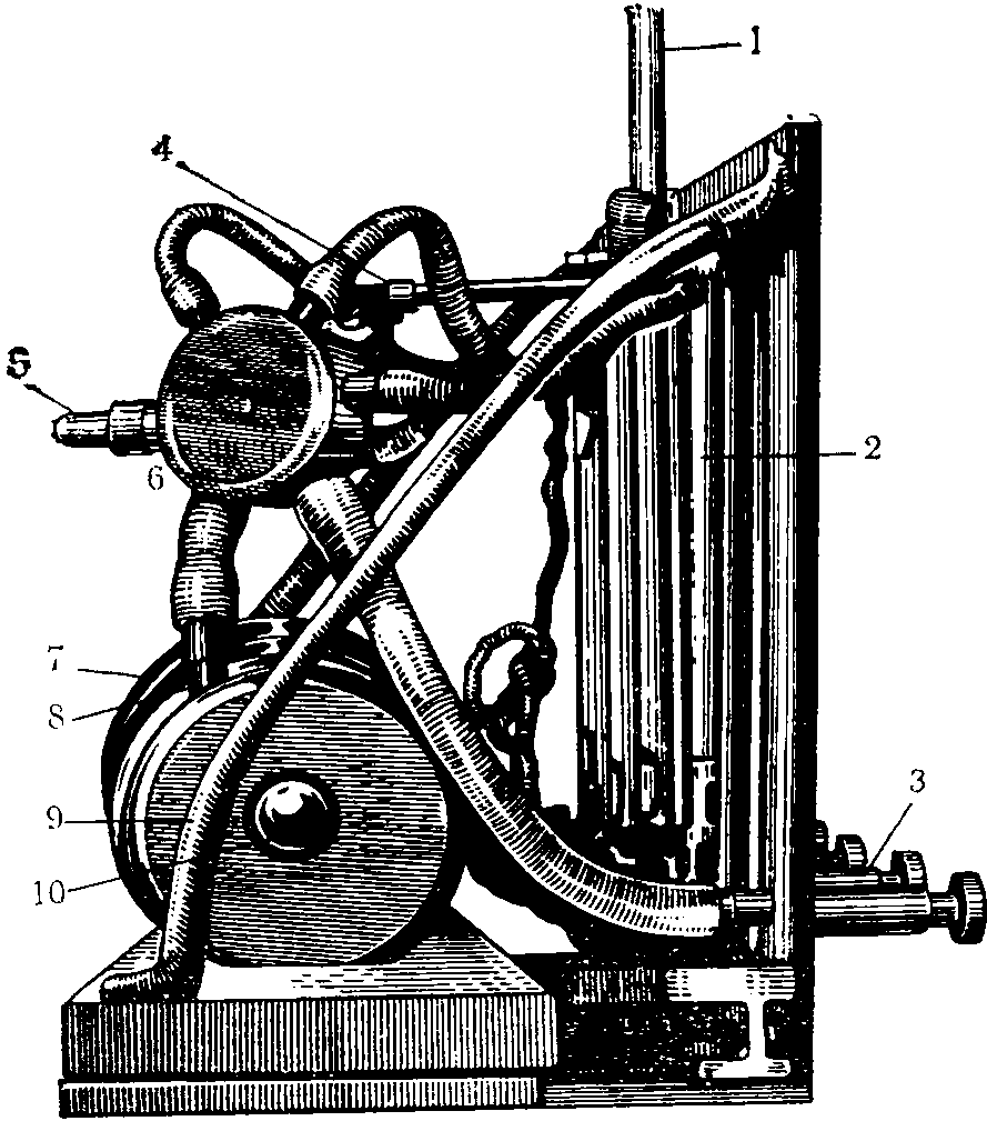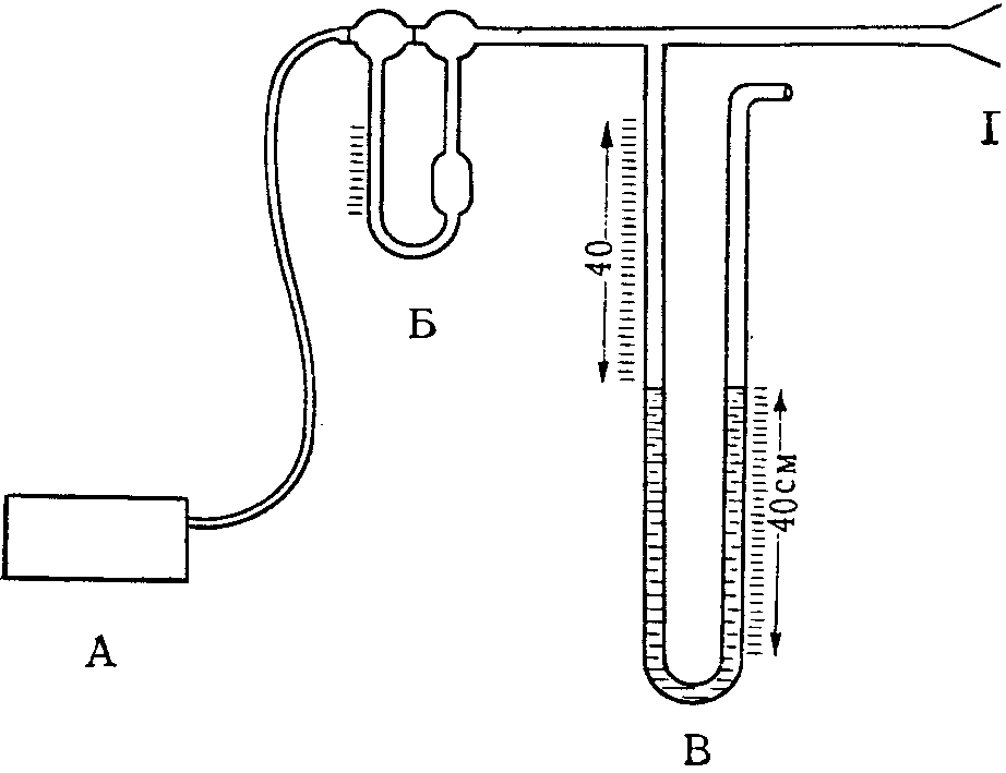 9. Включить аспиратор и, пользуясь дырчатой заслонкой, помещенной на противоположном конце, где находится патрон-насадка, отрегулировать протягивание воздуха по манометру.