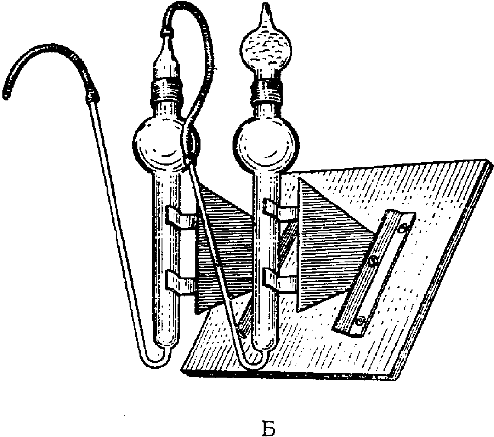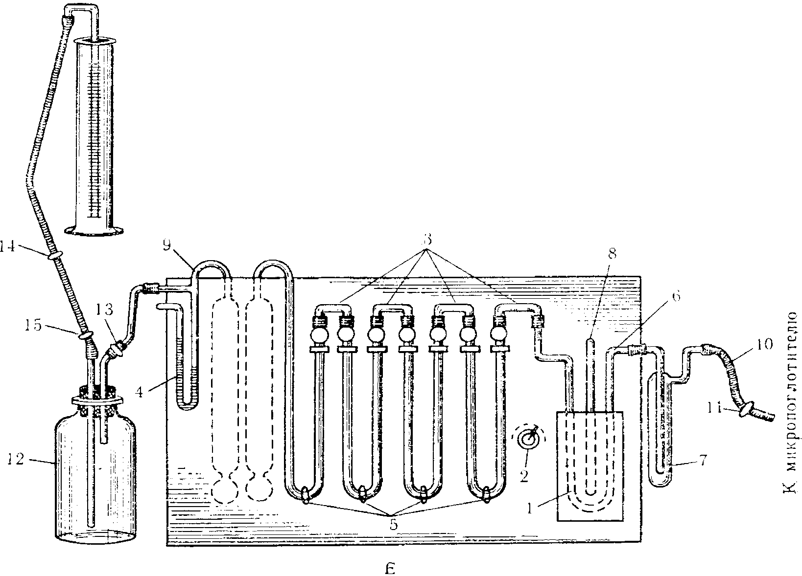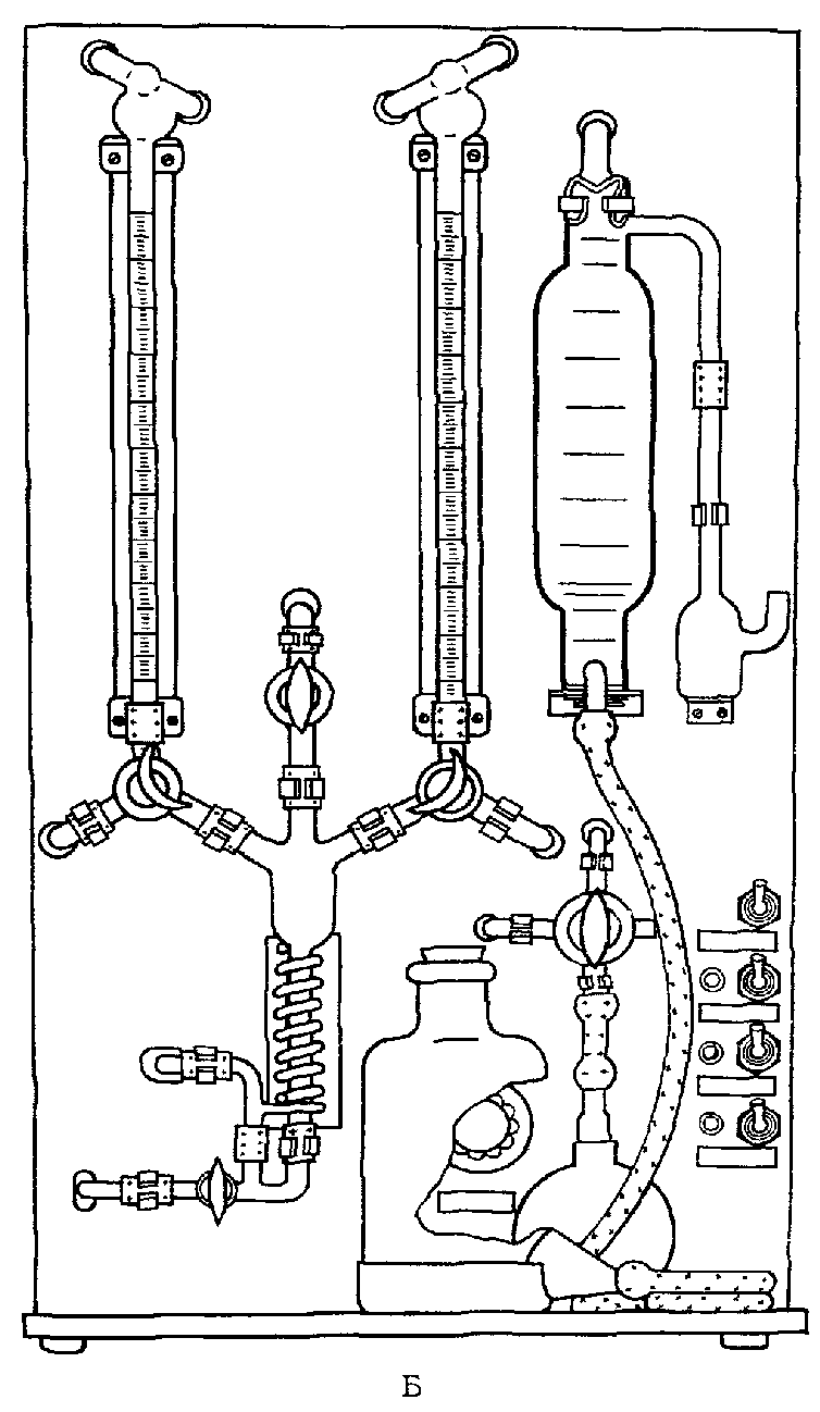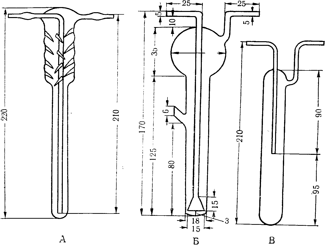 а) Т-образная труба из разборного конусовидного стакана. Один конец трубы имеет втулку для укрепления патрона-насадки и два боковых отростка, к которым присоединяется манометр типа реометра, служащий для установления скорости отбора проб. Между этими отростками в трубе помещена диафрагма. Второй, противоположный, конец трубы имеет два отверстия, закрывающиеся дырчатой заслонкой, служащей для впуска воздуха в трубу мимо патрона насадки. Третий конец трубы (более узкий) служит для присоединения аспиратора с входным отверстием карбюратора автомашины.