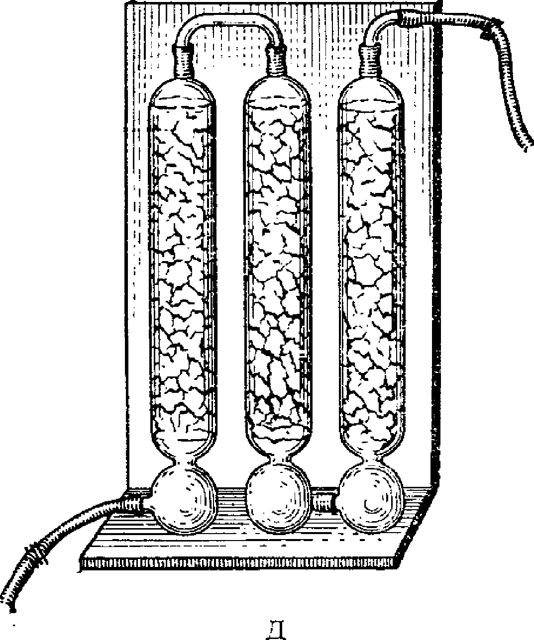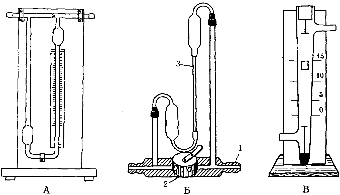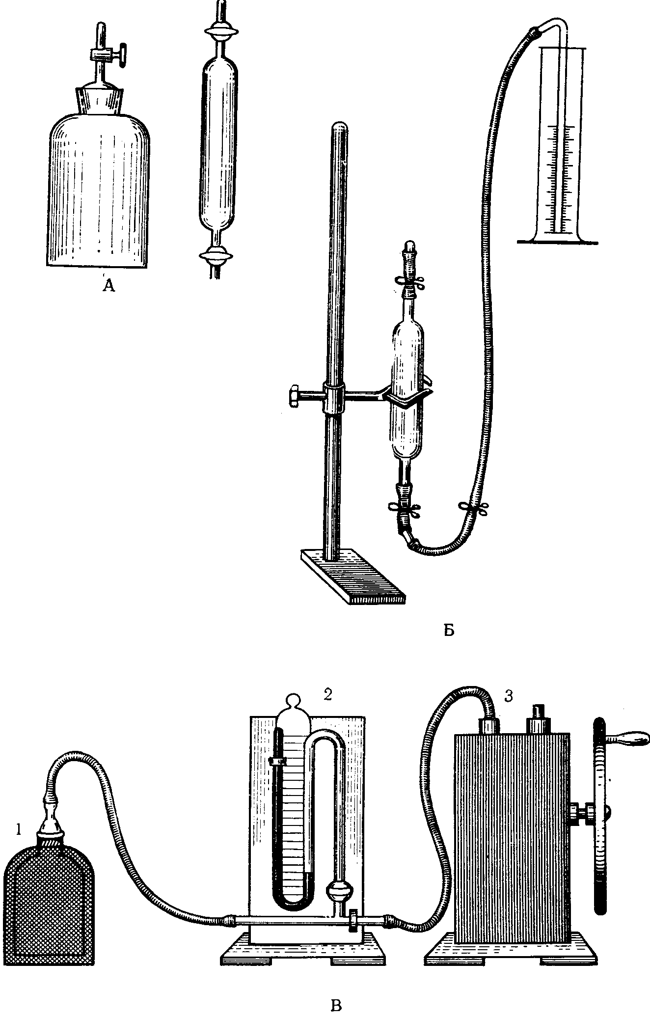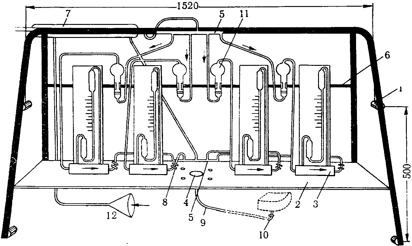а) Т-образная труба из разборного конусовидного стакана. Один конец трубы имеет втулку для укрепления патрона-насадки и два боковых отростка, к которым присоединяется манометр типа реометра, служащий для установления скорости отбора проб. Между этими отростками в трубе помещена диафрагма. Второй, противоположный, конец трубы имеет два отверстия, закрывающиеся дырчатой заслонкой, служащей для впуска воздуха в трубу мимо патрона насадки. Третий конец трубы (более узкий) служит для присоединения аспиратора с входным отверстием карбюратора автомашины.