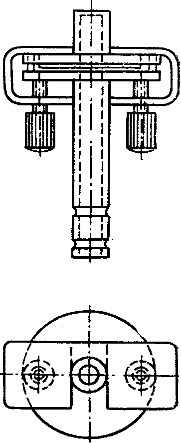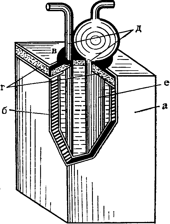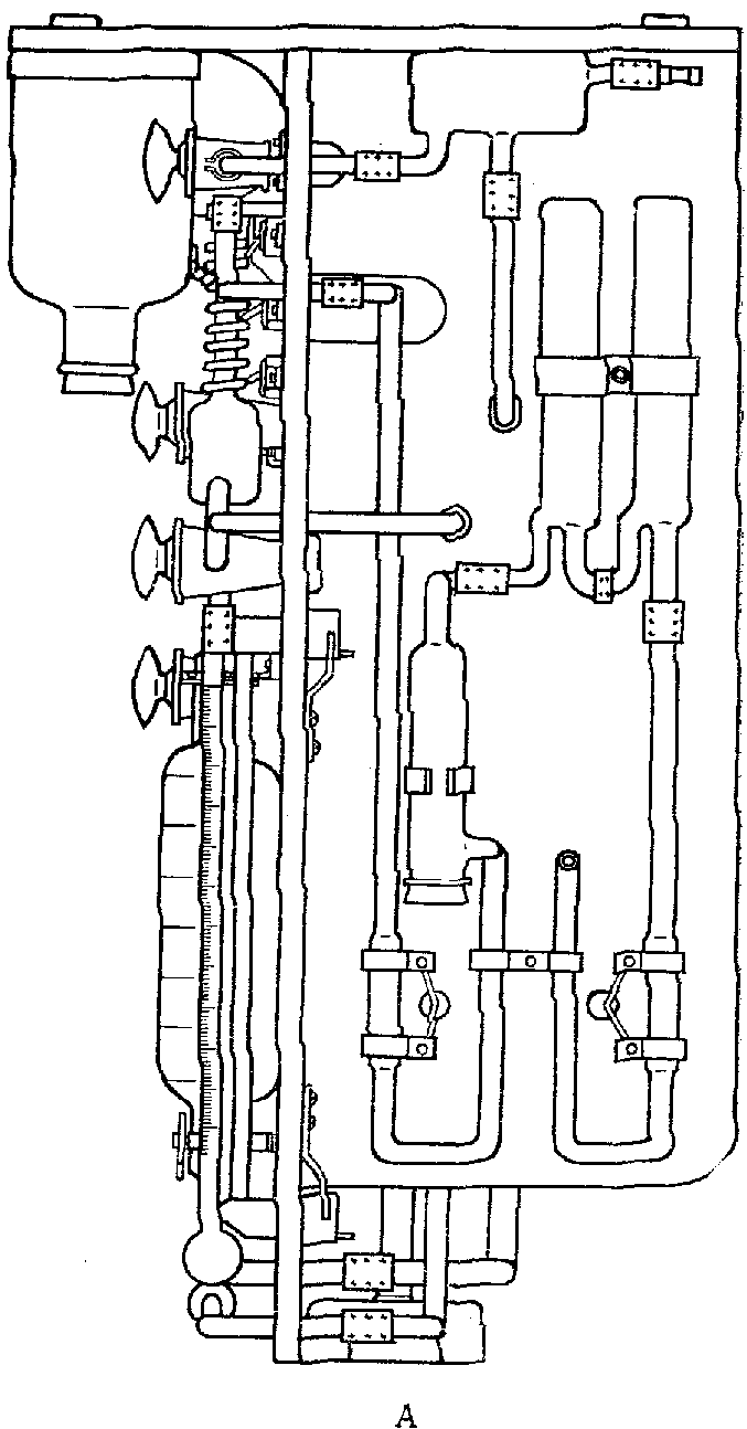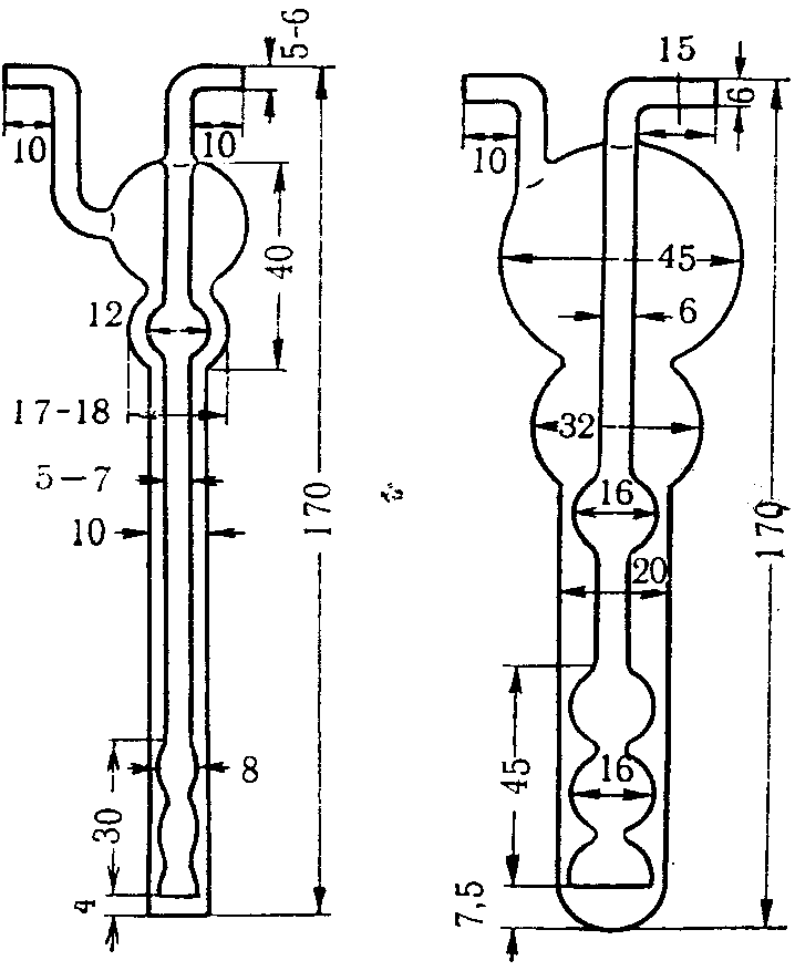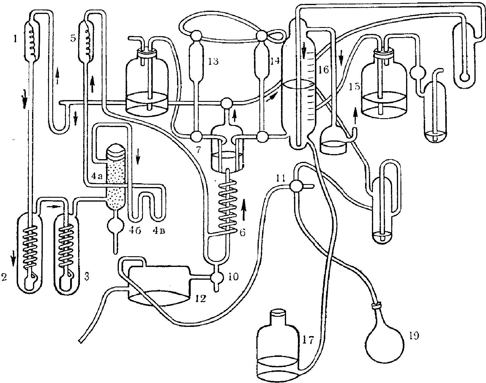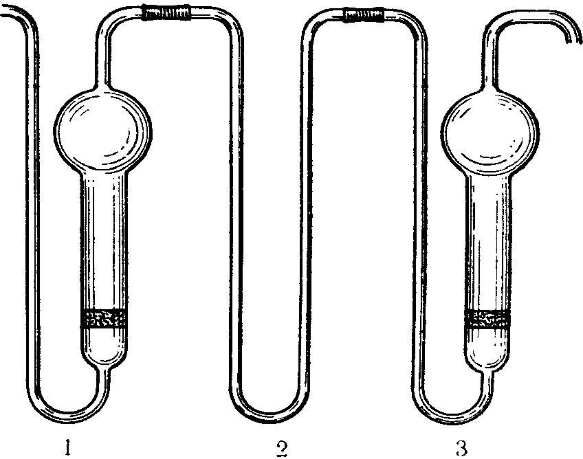 а) Т-образная труба из разборного конусовидного стакана. Один конец трубы имеет втулку для укрепления патрона-насадки и два боковых отростка, к которым присоединяется манометр типа реометра, служащий для установления скорости отбора проб. Между этими отростками в трубе помещена диафрагма. Второй, противоположный, конец трубы имеет два отверстия, закрывающиеся дырчатой заслонкой, служащей для впуска воздуха в трубу мимо патрона насадки. Третий конец трубы (более узкий) служит для присоединения аспиратора с входным отверстием карбюратора автомашины.