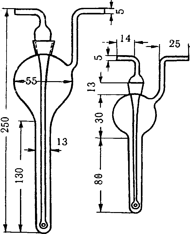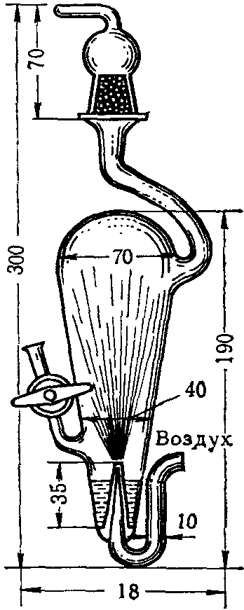 Разборный конусовидный стакан состоит из шести конусов, вставленных один в другой, диаметр их 11,7; 20; 25; 32; 40; 56 мм. Конусовидный стакан является средством уравнивания скорости отбора проб и скорости движения воздуха, а также для обеспечения поступления воздуха на всю рабочую поверхность фильтра, исключив возможность образования турбулентных завихрений, для чего угол корпуса не должен превышать 15°.