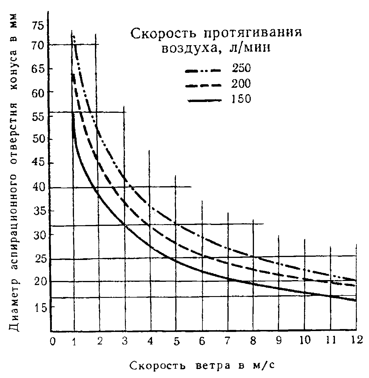 Для установления диаметра отверстия конуса измеряют скорость движения воздуха с помощью представленного графика