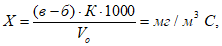 где а - количество двуокиси кремния, найденное в анализируемом объеме пробы (мкг); б - объем раствора, взятый для анализа (мл); в - общий объем пробы (мл); г - навеска пыли (мг); 1/1000 - коэффициент пересчета микрограммов в миллиграммы; 100 - коэффициент пересчета найденного количества двуокиси кремния в проценты.