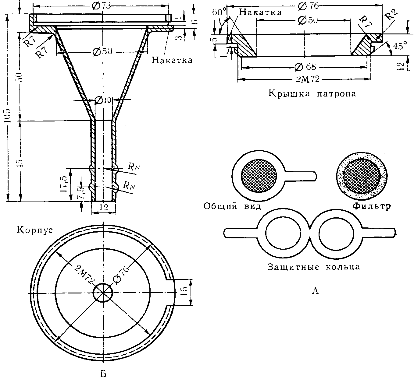 Корпус служит для крепления патрона в Т-образной трубке - аспирационной части автомобильного аспиратора. В корпус помещают кассету с фильтром, с наружной стороны его имеются два штифта, с помощью которых крепится крышка-насадка.