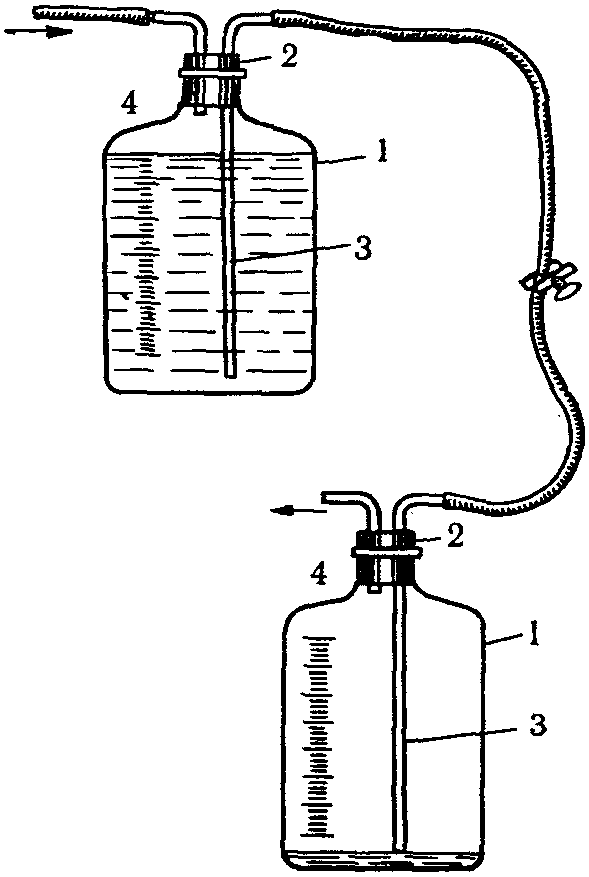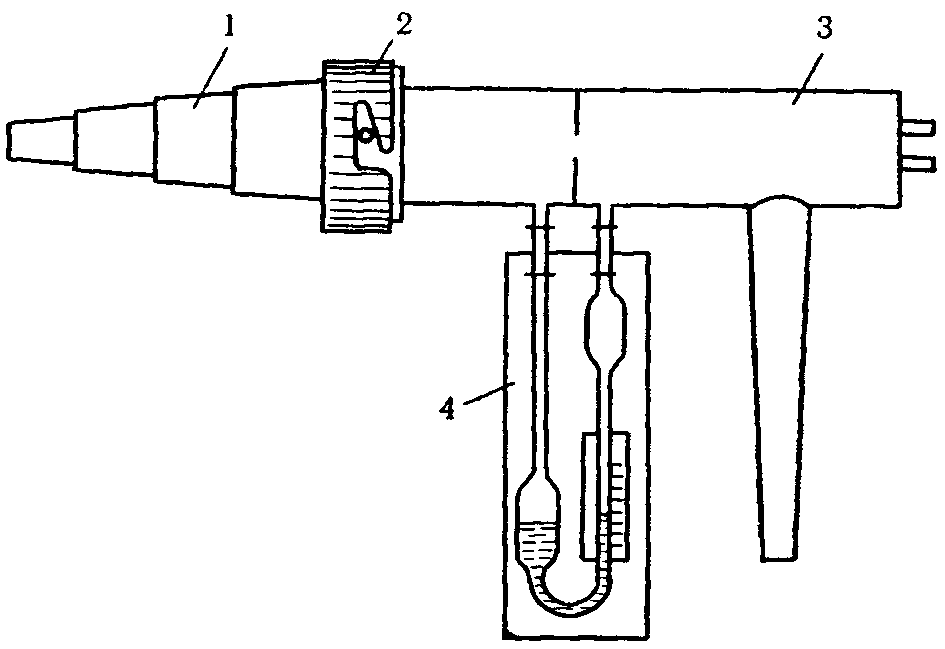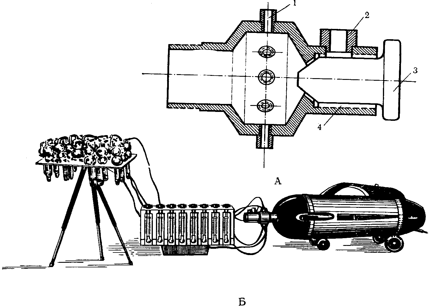 Автомобильный аспиратор системы Института имени Ф.Ф. Эрисмана (рис. 28). Он состоит из Т-образной трубы (3), патрона-насадки (2), манометра (4) и разборного конусовидного стакана (1).