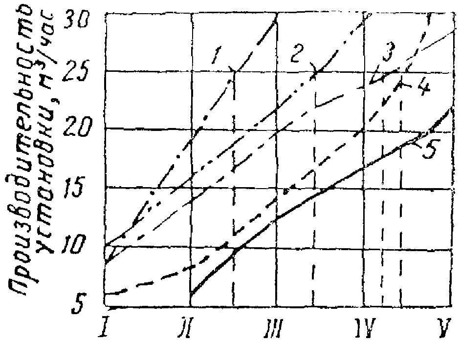 После тарирования всех дозаторов установки строят график производительности бетонного завода в зависимости от положения стрелки вариатора каждого дозатора (рис. 1).