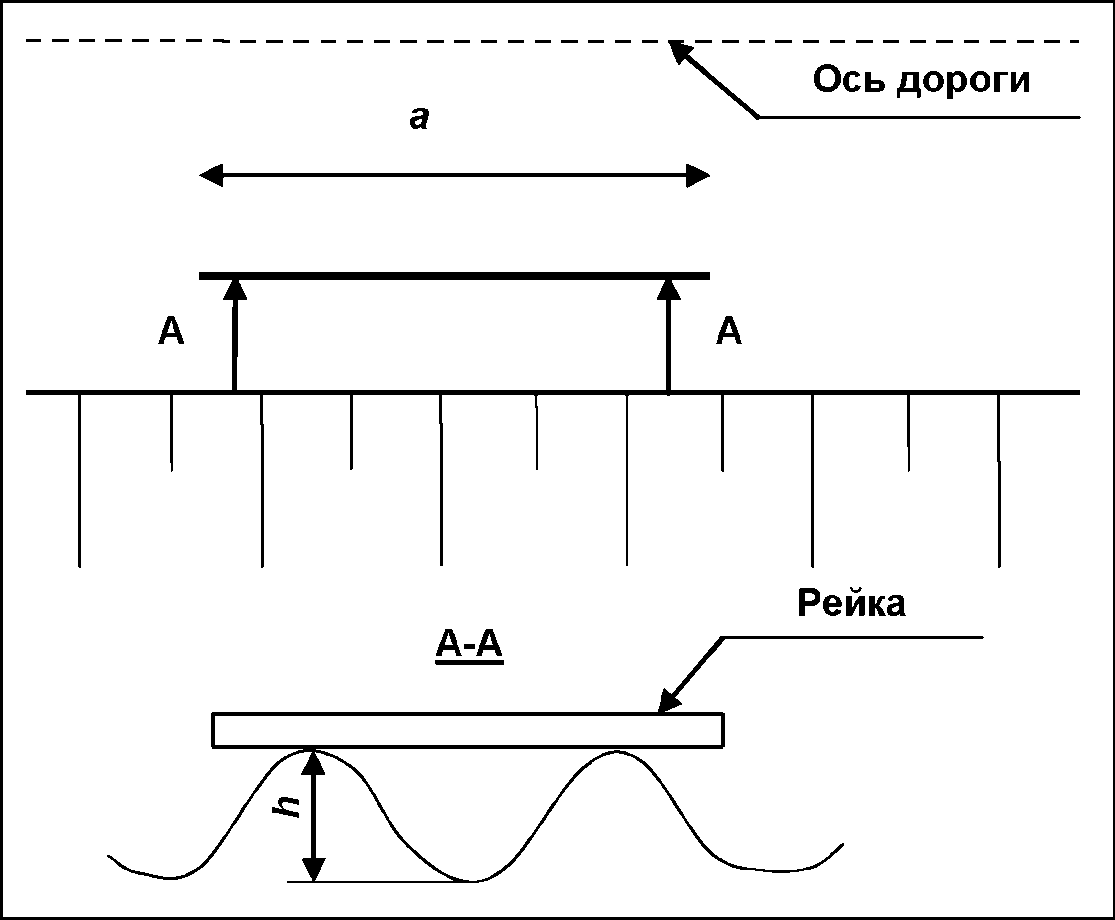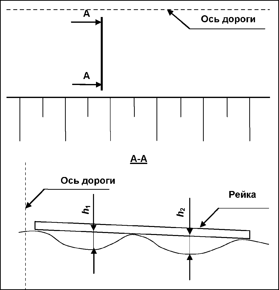 Сущность метода заключается в измерении клиновым промерником или металлической линейкой максимального просвета под трехметровой рейкой, уложенной на дорожное покрытие перпендикулярно к оси автомобильной дороги.